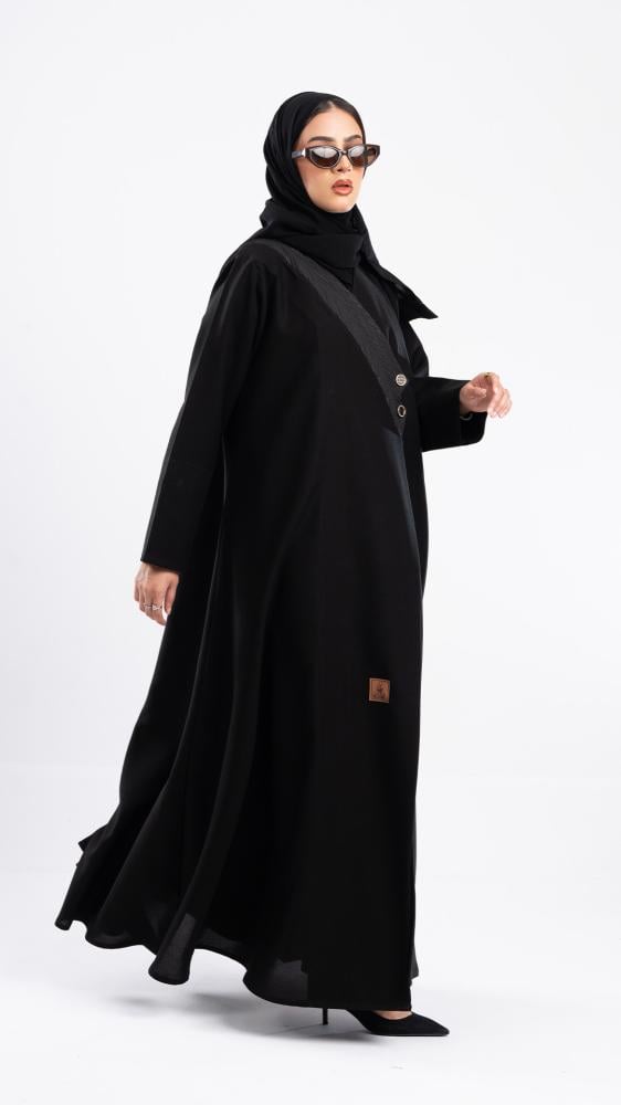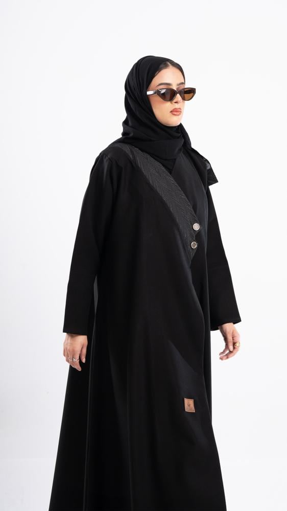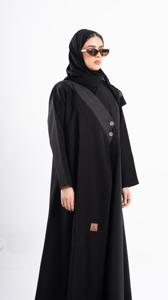 تتميز بتصميم مبتكر يبرز شريطًا مائلًا من الكتف إلى منتصف الصدر مزين بأزرار فضية، ليضيف لمسة من الرقي والتميز. مصنوعة من قماش أسود ناعم ينسدل بأناقة، لتجمع بين الفخامة والبساطة في كل تفصيلة.