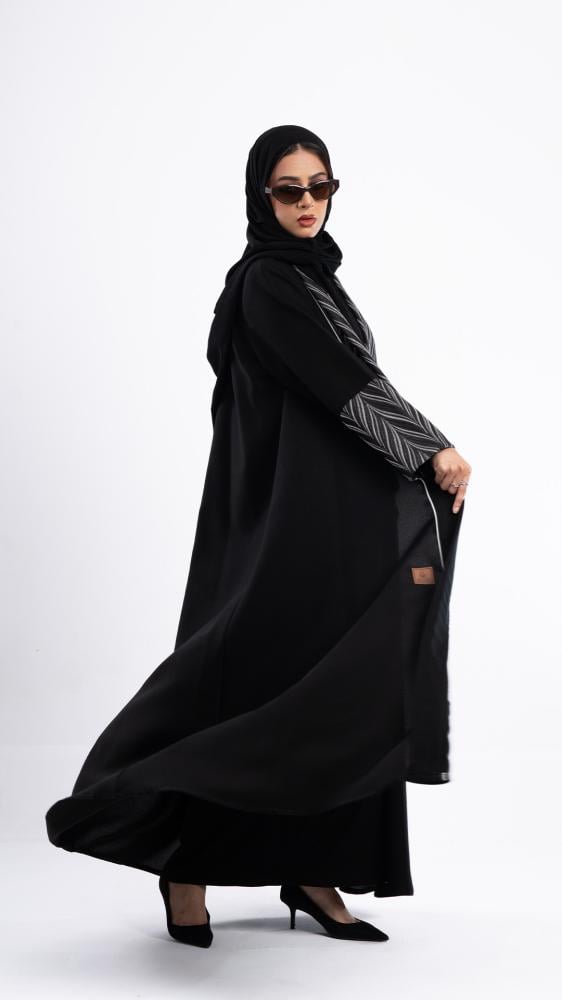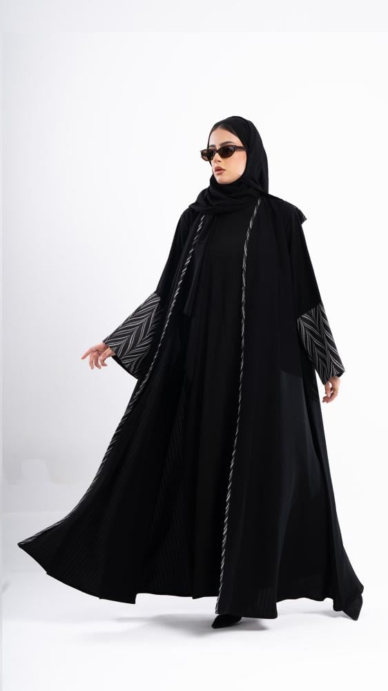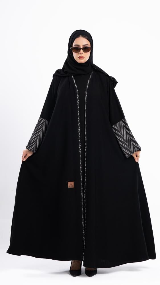 لمسة فخامة باللون الأسود الكلاسيكي، تزيّنها تطريزات رقيقة مع ترتر رمادي غامق على الأكمام تمنحك بريقاً ناعماً وأناقة لا تُقاوم. صممت بقصه انسيابية ا لتلائم كل مناسباتك. مع طرحة مجانية مطرزة من نفس العباية وجربي تنسيقها مع فستان عباية