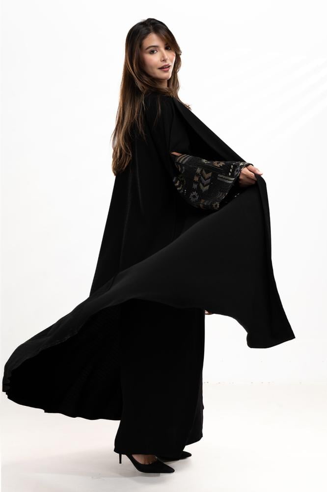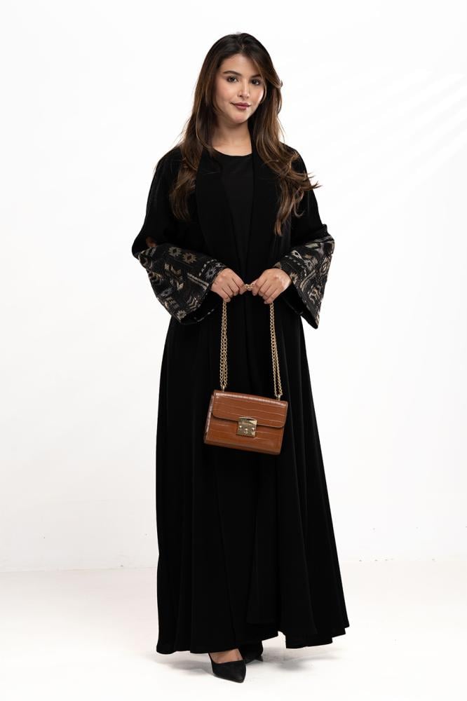 لمسة فخامة باللون الأسود الكلاسيكي، تزيّنها تطريزات بيج رقيقة مع ترتر على الأكمام تمنحك بريقاً ناعماً وأناقة لا تُقاوم. صممت بقصه انسيابية ا لتلائم كل مناسباتك. مع طرحة مجانية مطرزة من نفس العباية وجربي تنسيقها مع فستان عباية