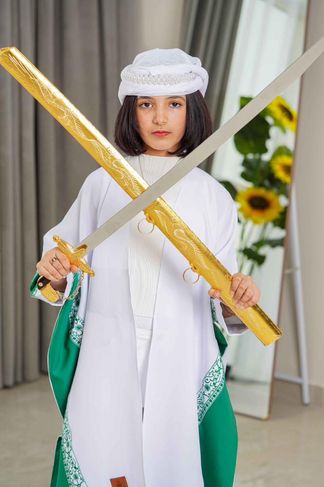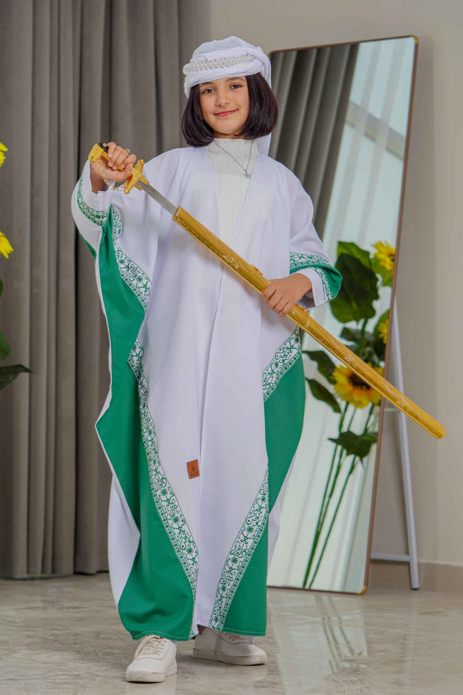 من عروض عبايات اليوم الوطني للفتيات الصغيرات يقدم موقع زاهيه بشت اليوم الوطني للبنات، المنسوج بتناغم بين اللونين الأبيض والأخضر، يمكن اعتباره أيضًا من أزياء يوم التأسيس فهو يجسد بنقشاته معاني الوطنية.