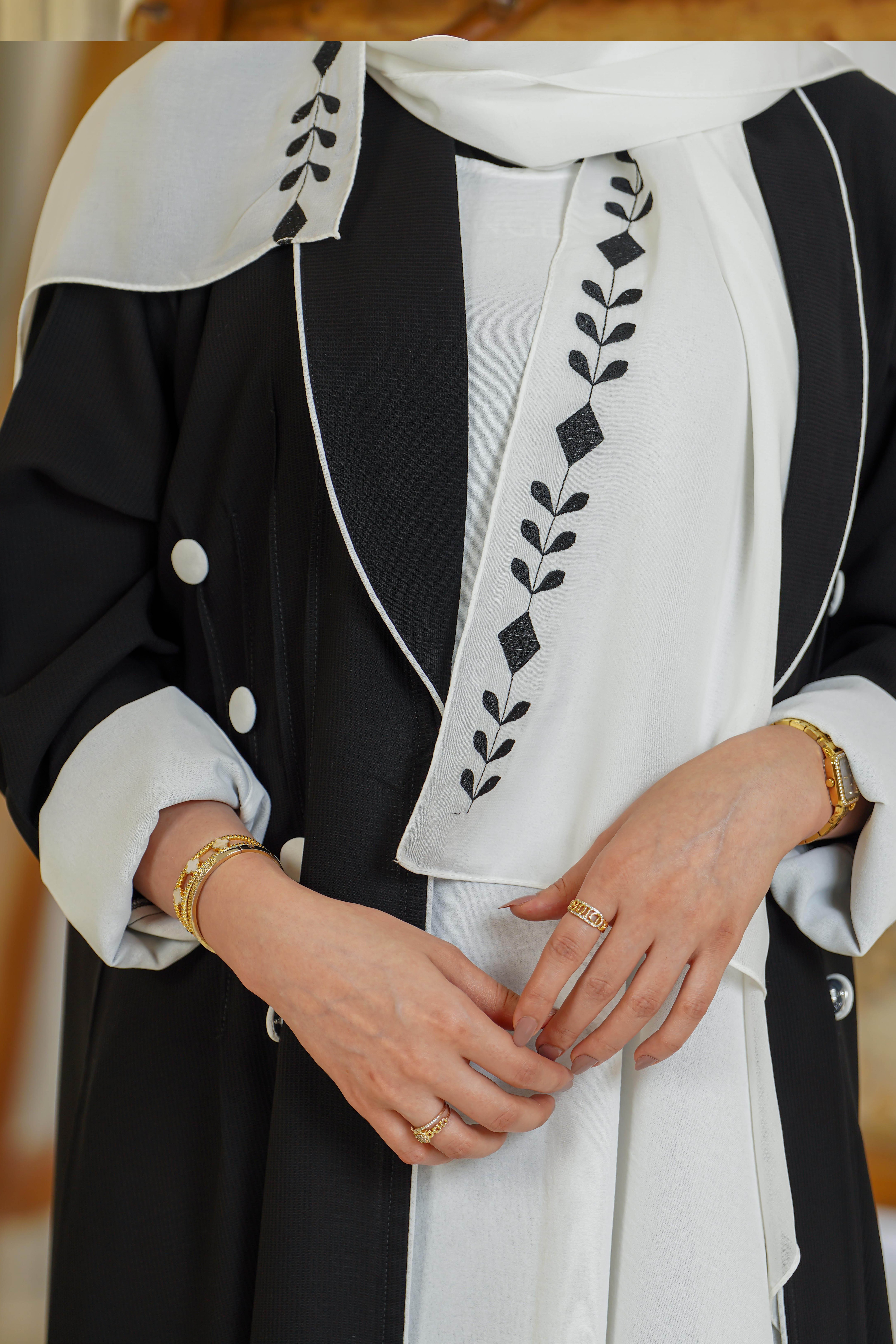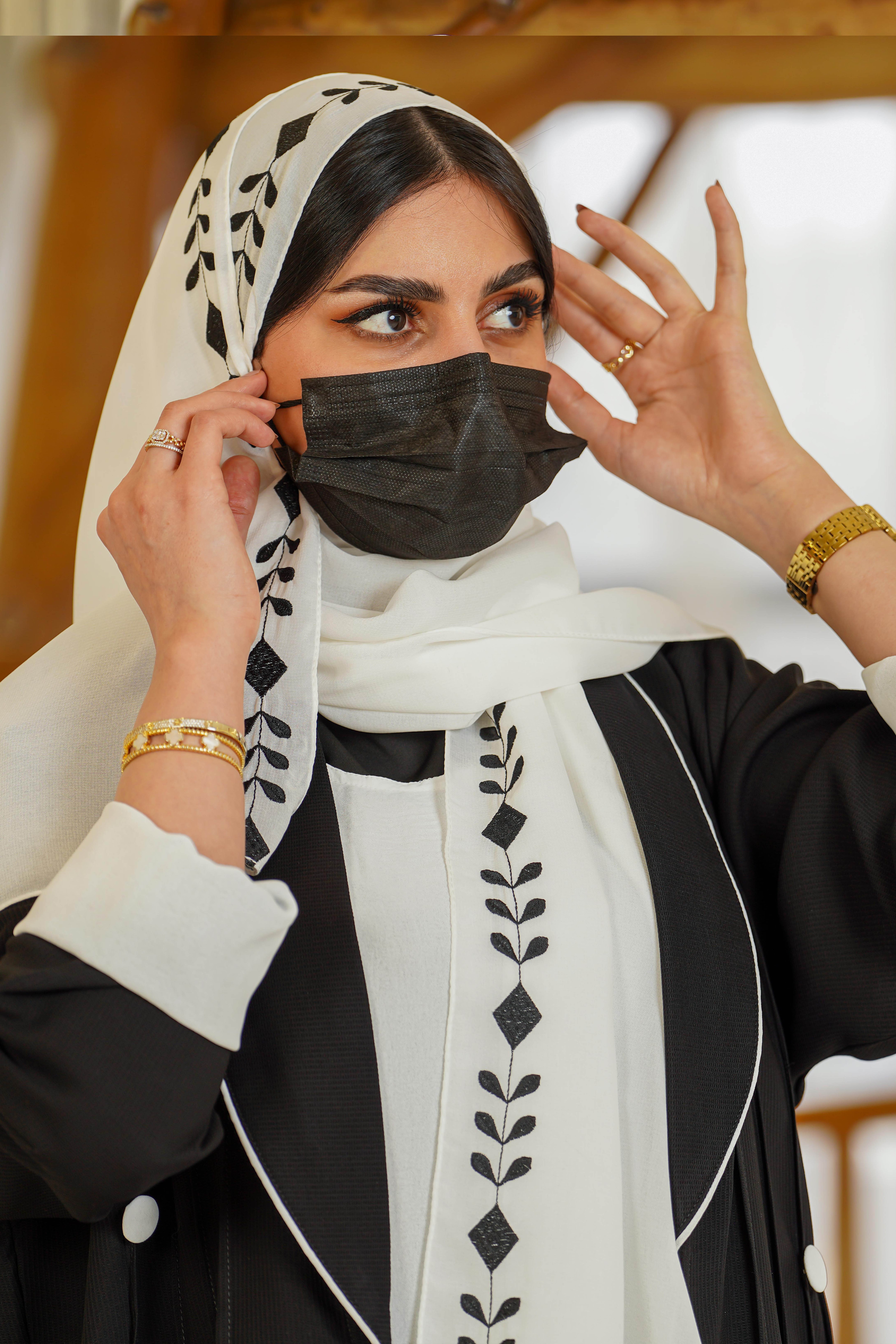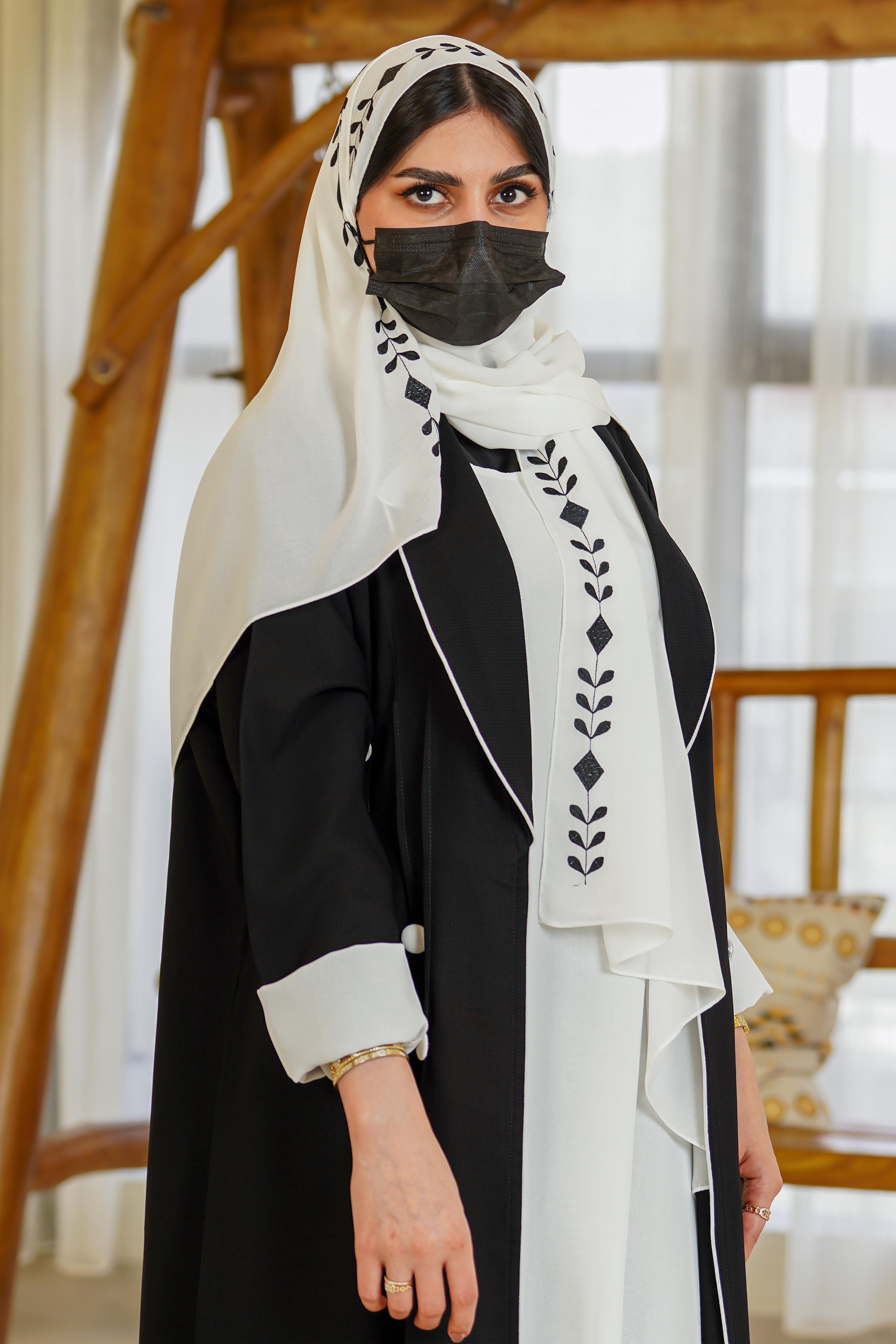 طرحة أوف وايت فاخرة بتطريز أسود بنقش أندلسي فاتن يضفي طابع شرقي راقي، منسوجة من قماش ليزر ناعم وطايح، يتميز بأنه مريح وبارد وسهل الارتداء ما يجعلها مثالية لكل يوم!