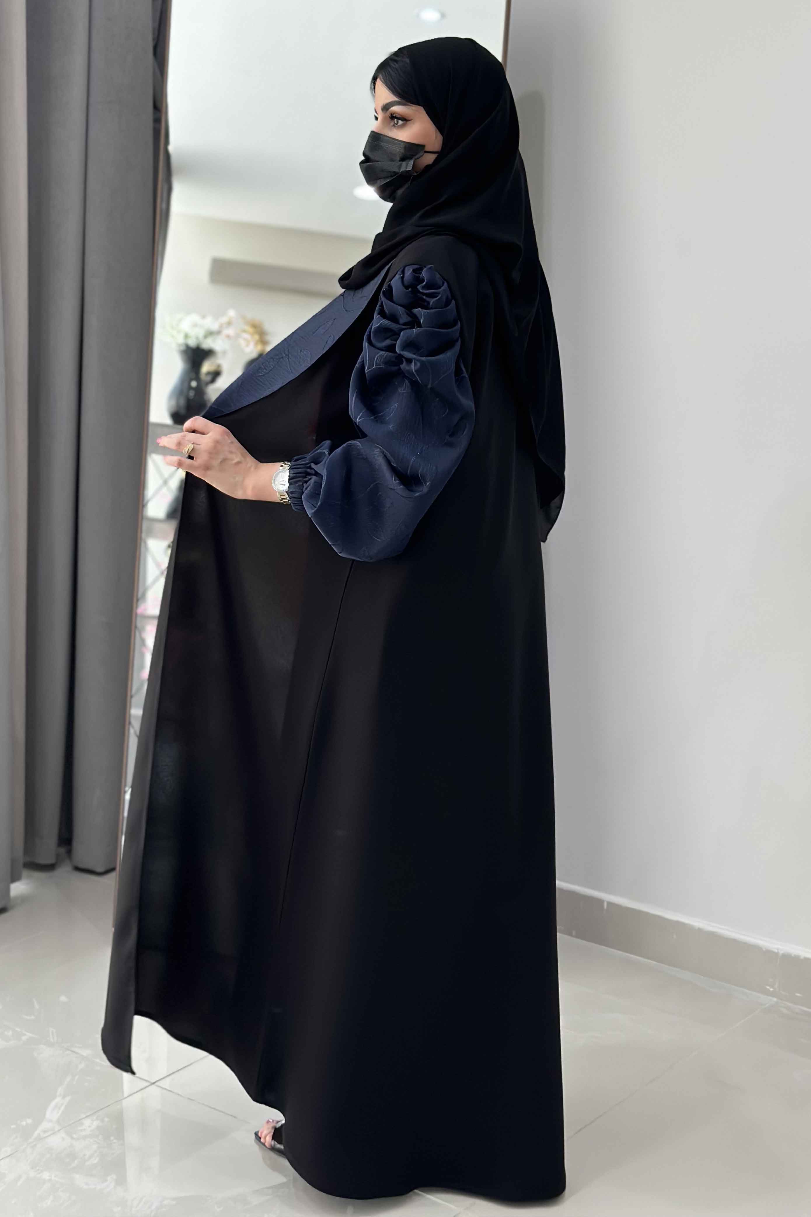 عبايه سوداء من قماش الكتان الفاخر بتدخيلات قماش الجاكر الكحلي علي الياقة والكم،بقصة كم مزموم ومجنح باحدث الموضة ! لستايل ناعم يمكن تنسيقها مع فستان تحت العباية ، وملائمةللمناسبات وكذلك عباية طلعات.