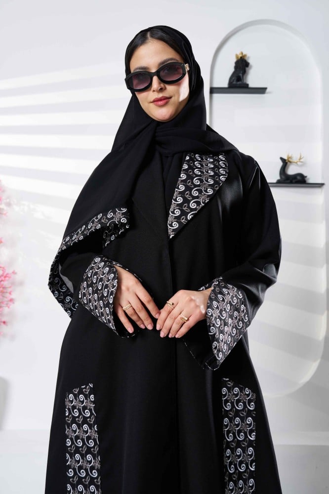عباية سوداء فاخرة بتدخيلات تطريز من الامام والياقة