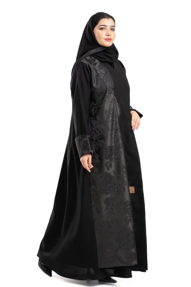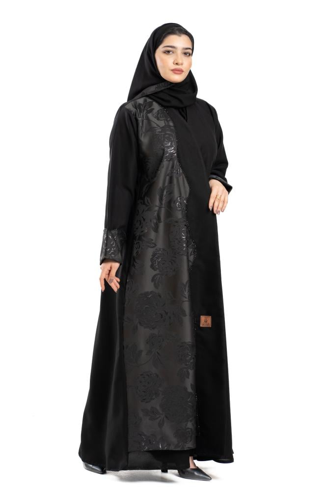 تألقت العباية السوداء الناعمة بتفاصيل تصميم دقيقة العباية مصنوعة من قماش عملي بقصة مموجة تنطلق من الجانب الأيمن لتضفي حركة ديناميكية على الإطلالة. يتميز التطريز على العباية بوردكحلي رقيق مطرز بعناية تُزيَّن تفاصيله بتوزيع متناغم للخرز والكرستال المنثور على الأزهار مما يبرز الحرفية العالية واللمسة الفنية الراقية في التصميم صممت بقصه انسيابية ا لتلائم كل مناسباتك. مع طرحة مجانية مطرزة من نفس العباية وجربي تنسيقها مع فستان عباية