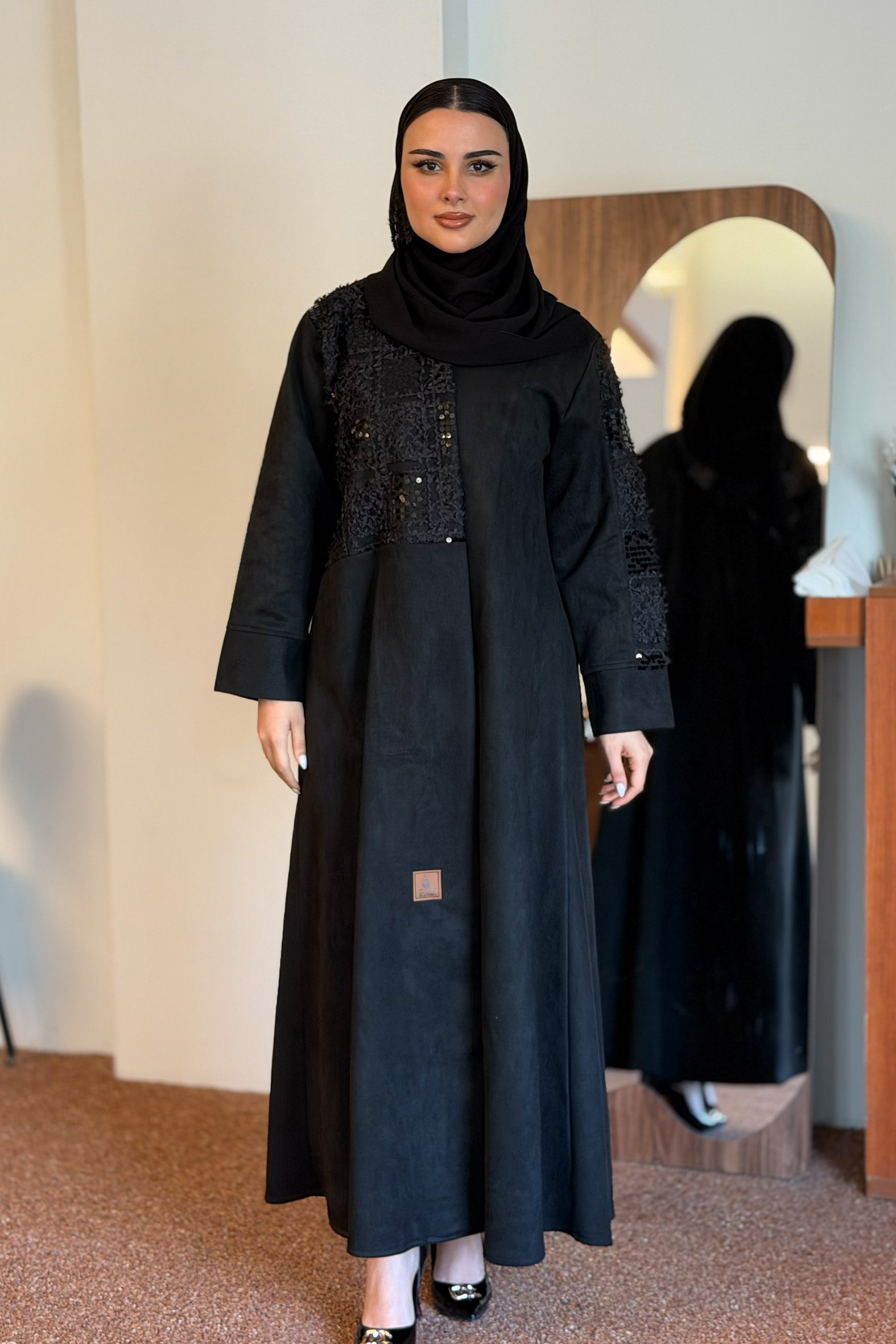 عباية عبير شتوية منسوجة من قماش الشامواه الاسود مع تدخيلات قماش مطرز بورود ناعمة ومرصعة بشك كريستال فاخر على الأكمام وامام العباية. صممت لتناسب الاستخدام اليومي والطلعات تصميمها الناعم يضفي لمسة من الجاذبية والرقي مما يجعلها مثالية للإطلالات المميزة صممت بقصه انسيابية العباية ناعمة بالحركة لتلائم كل مناسباتك الشتوية. مع طرحة مجانية وجربي تنسيقها مع فستان عباية
