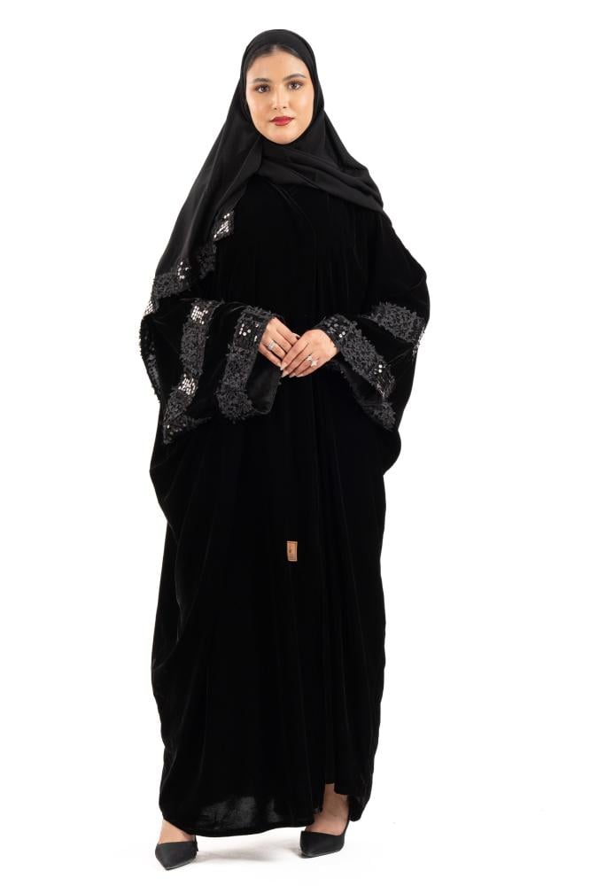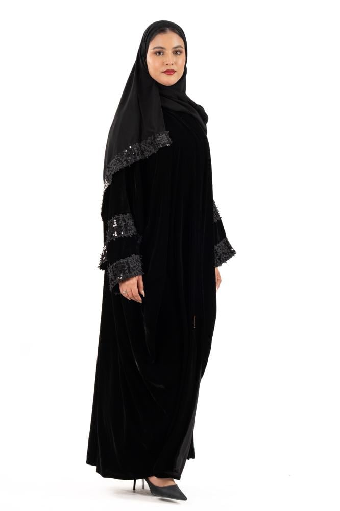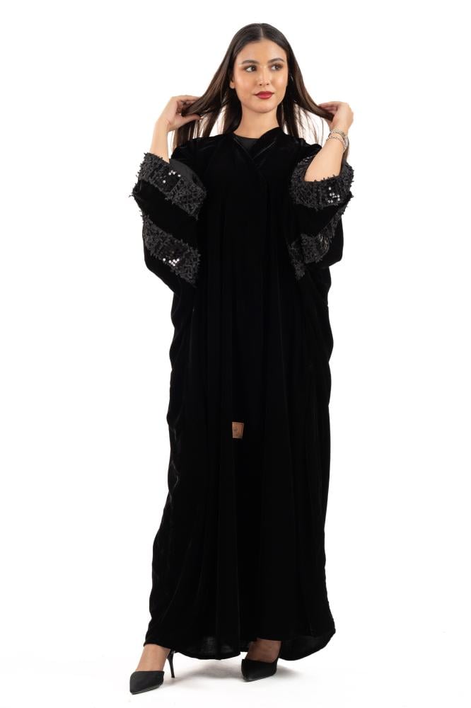 عباية مرام شتوية منسوجة من قماش المخمل الكحلي مع تدخيلات قماش مطرز بورود ناعمة ومرصعة بشك كريستال فاخر على الاكمام والاكتاف صممت لتناسب الاستحدام اليومي والطلعات تصميمها الناعم يضفي لمسة من الجاذبية والرقي مما يجعلها مثالية للإطلالات المميزة صممت بقصه انسيابية العباية ناعمة بالحركة لتلائم كل مناسباتك الشتوية. مع طرحة مجانية وجربي تنسيقها مع فستان عباية