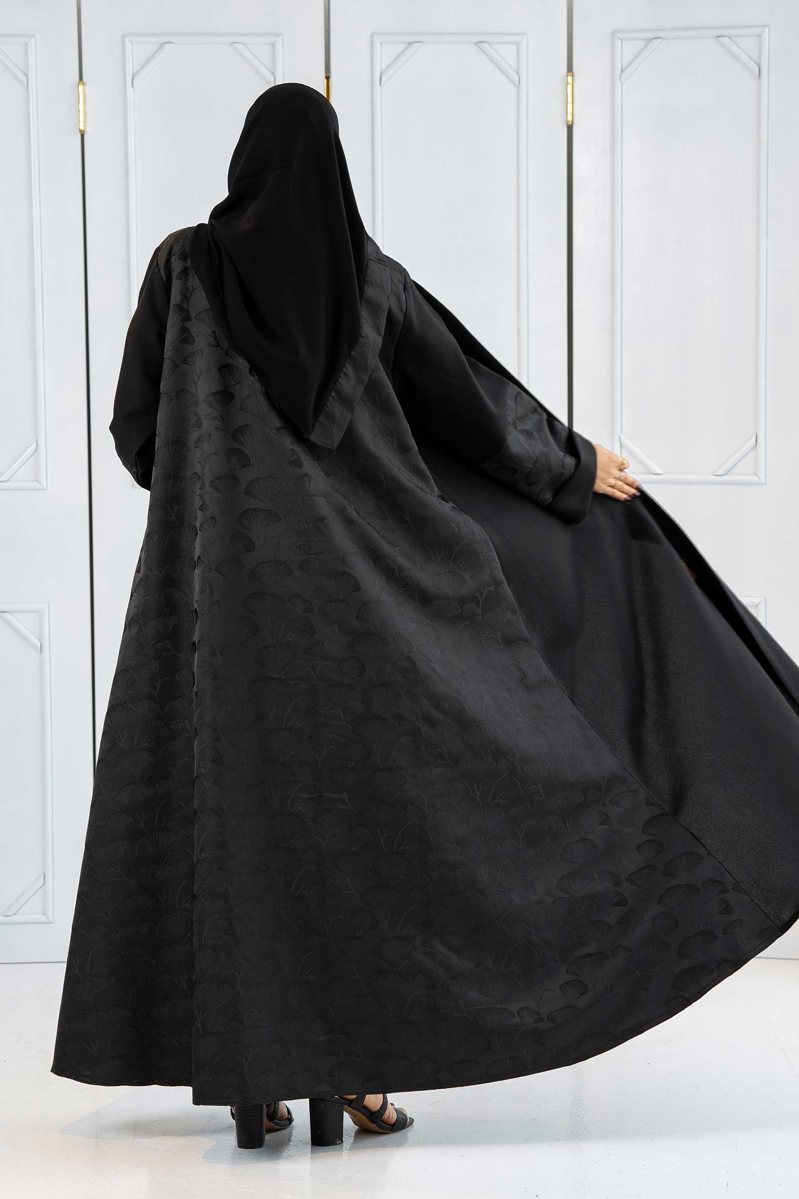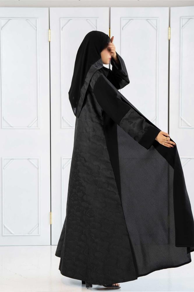 عباية كلوش فاخرة بتصميم انسيابي يعكس الأناقة مزينة بتدخيلات جاكار هندي بنقشة شجرة فريدة على الخلف والأكمام مما يضفي لمسة راقية من الفخامة والجمال. مثالية لإطلالة أنثوية مميزة تجمع بين الأنافة العصرية والكلاسيكية صممت بقصه انسيابية ا لتلائم كل مناسباتك. مع طرحة مجانية مطرزة من نفس العباية وجربي تنسيقها مع فستان عباية