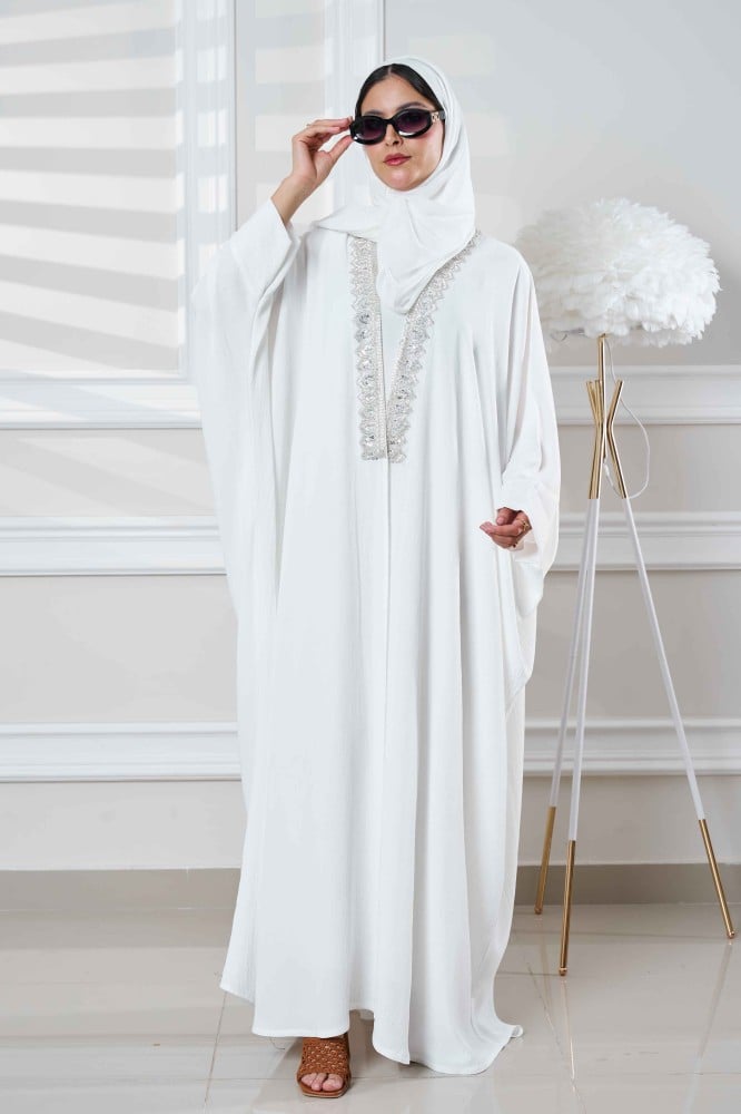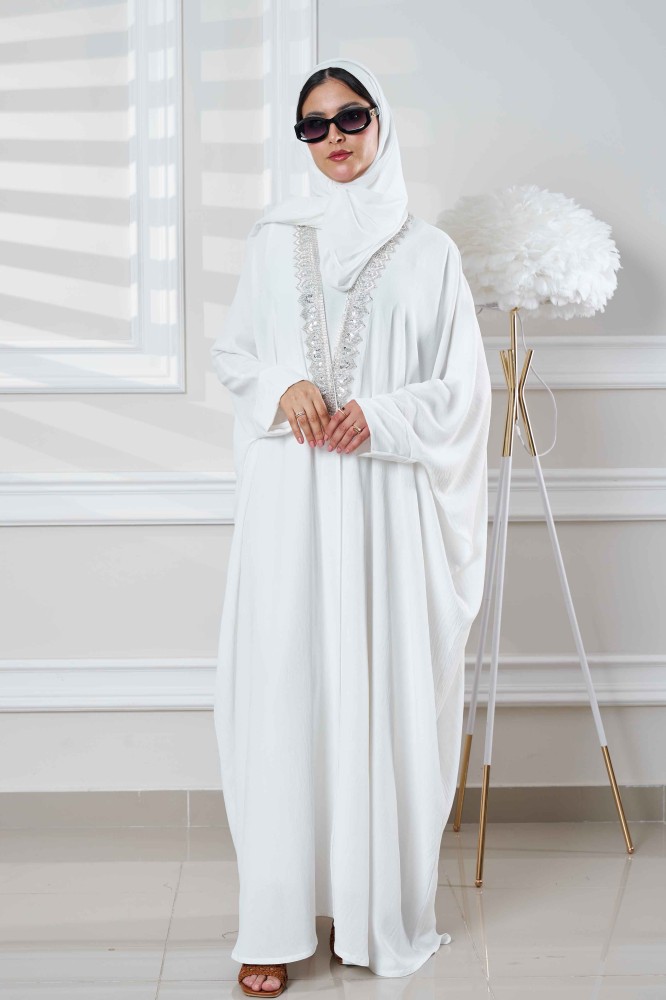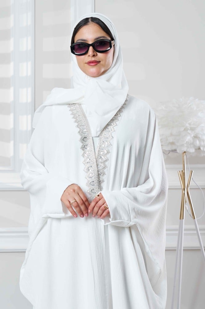 عباية بشت ابيض بتدخيلات شك ابيض من الامام والكم, العباية عصرية أنيقة بقصه بشت انسيابية صممت العباية لتمنحك اطلالة افضل تلائم مناسباتك وطلعاتك مع طرحة هدية مجانبة
