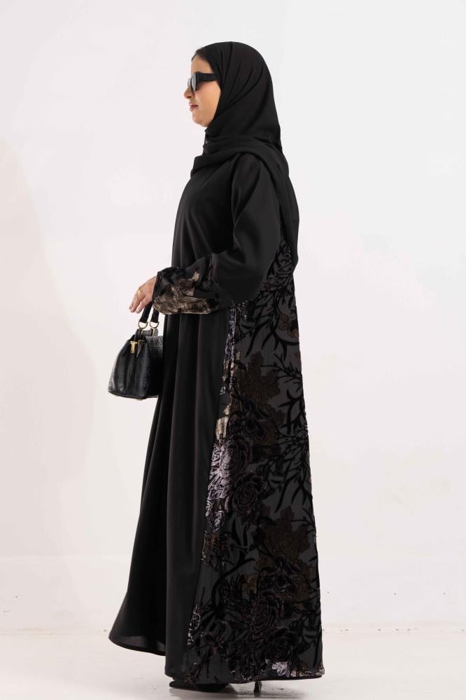 عباية سوداء أنيقة بتصميم فريد يجمع بين الرقي والفخامة تتميز العباية بتدخيلة من قماش الجاكار الفاخر في الخلف مزينة بتطريز راقٍ من الورود المخملية التي تضيف لمسة أنثوية ساحرة التصميم الانسيابي للعباية يمنحك إطلالة راقية مع تفاصيل دقيقة تعكس الأناقة العصرية مثالية للمناسبات الخاصة والإطلالات الفاخرة حيث تجمع بين الفخامة والراحة بكل أناقة