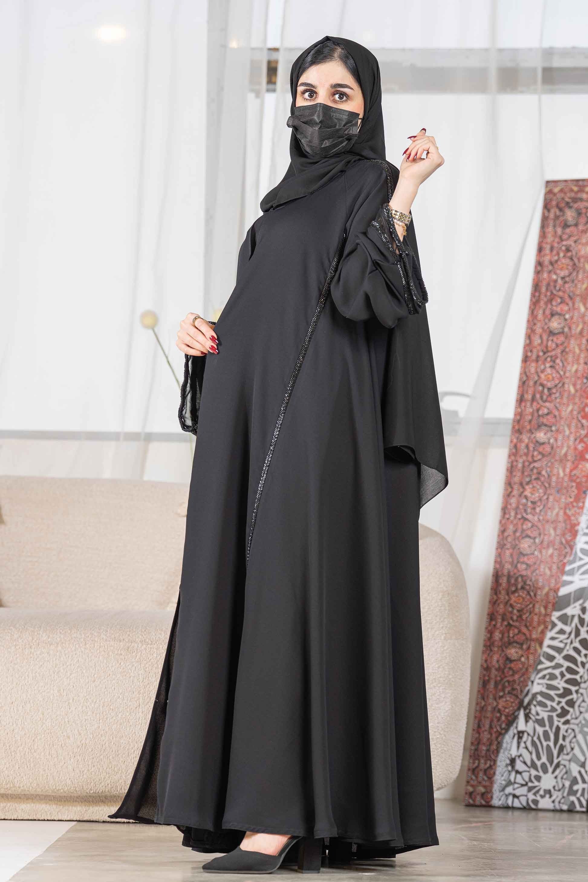 عباية سوداء ناعمة كلوش مع كريستال على طول العباية والأكمام، تجعلها ملائمة للحفلات والسهرات أو الخروجات اليومية، إليك أهم صفاتها: