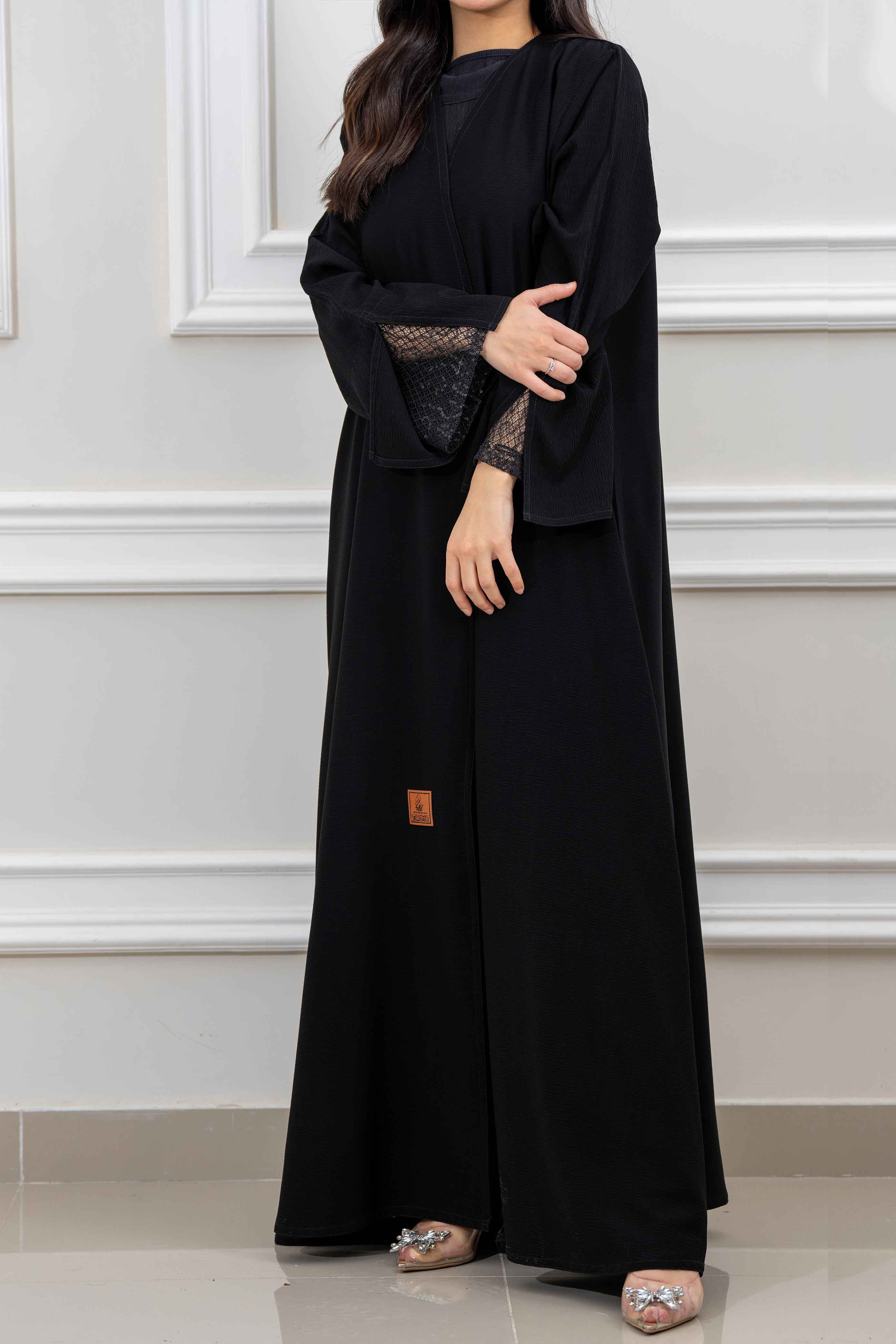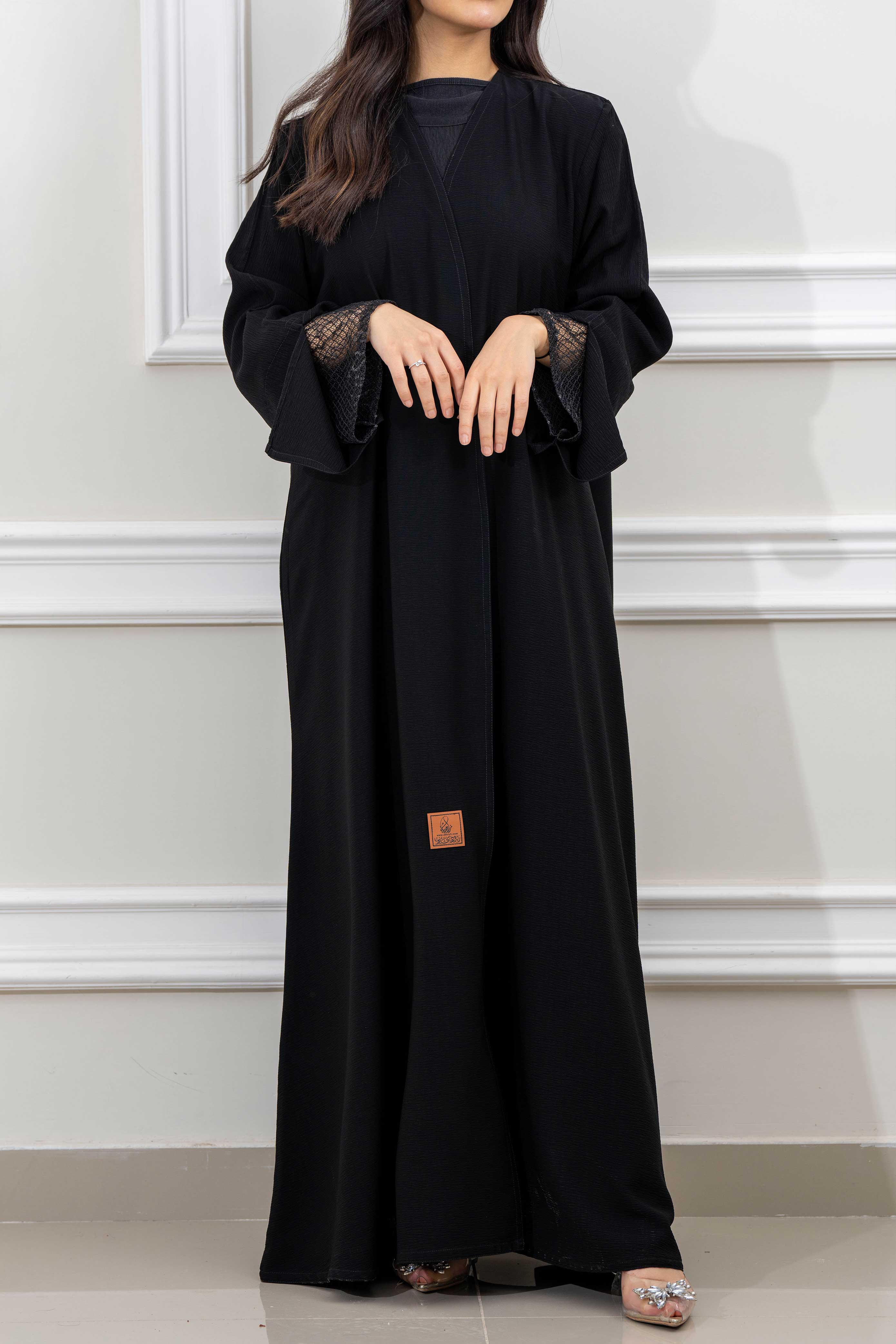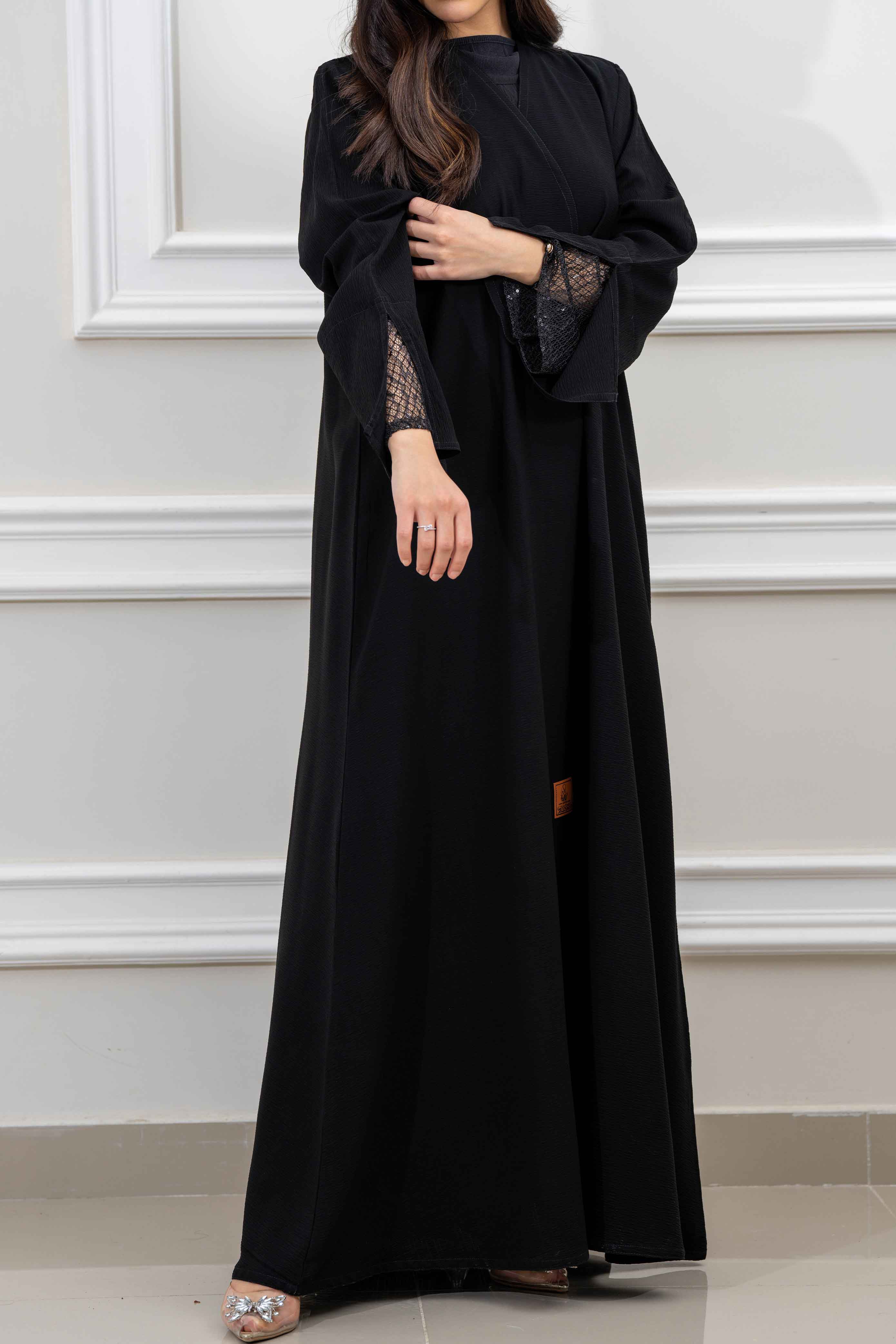 عباية كلوش نسائية أنيقة مزينة بتدخيلات قماش دانتيل اسود على الأكمام تصميمها الراقي يضفي لمسة من الفخامة والجاذبية مما يجعلها مثالية للمناسبات الخاصة والإطلالات المميزة صممت بقصه انسيابية العباية ناعمة بالحركة لتلائم كل مناسباتك. مع طرحة مجانية وجربي تنسيقها مع فستان عباية