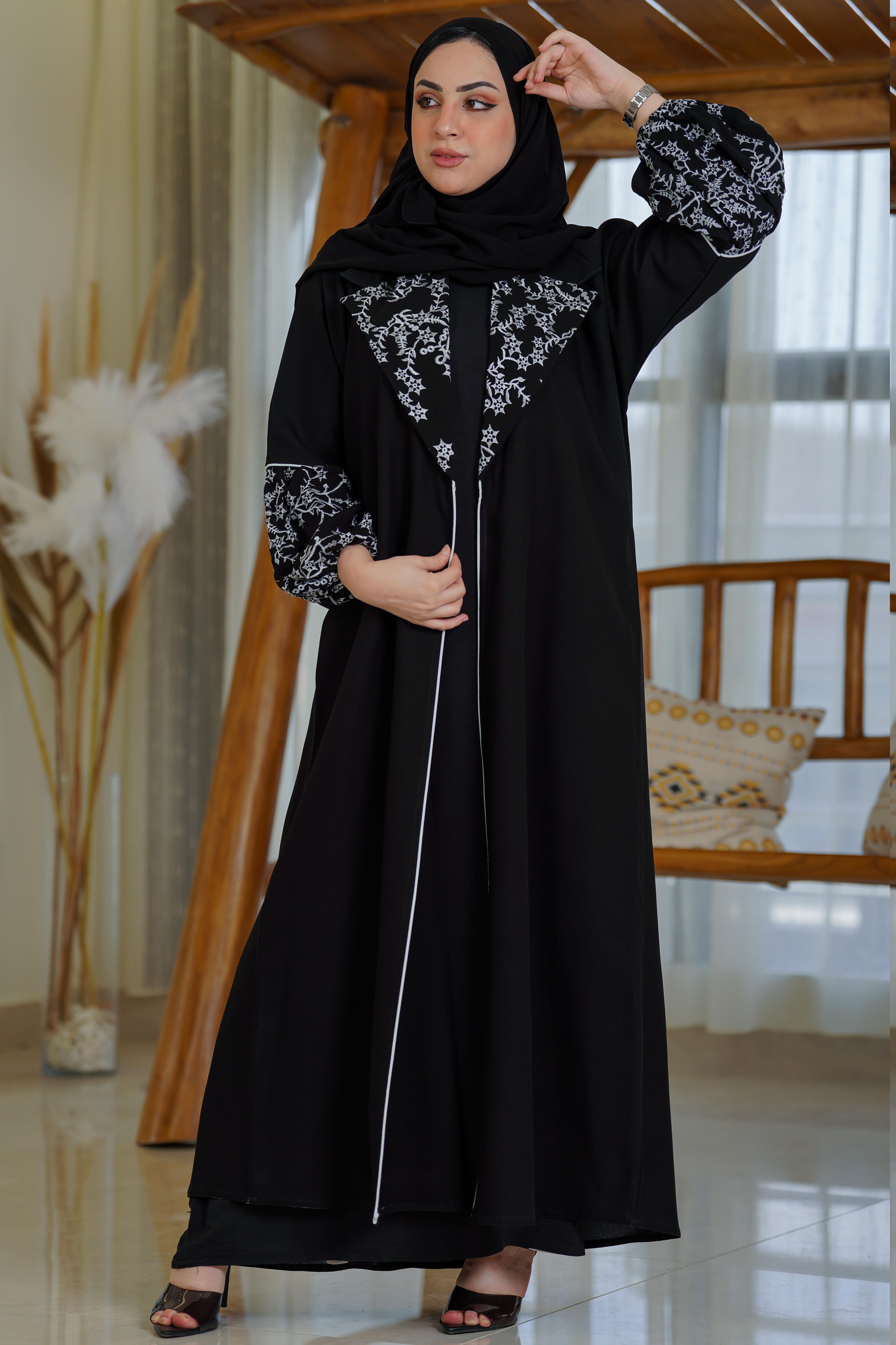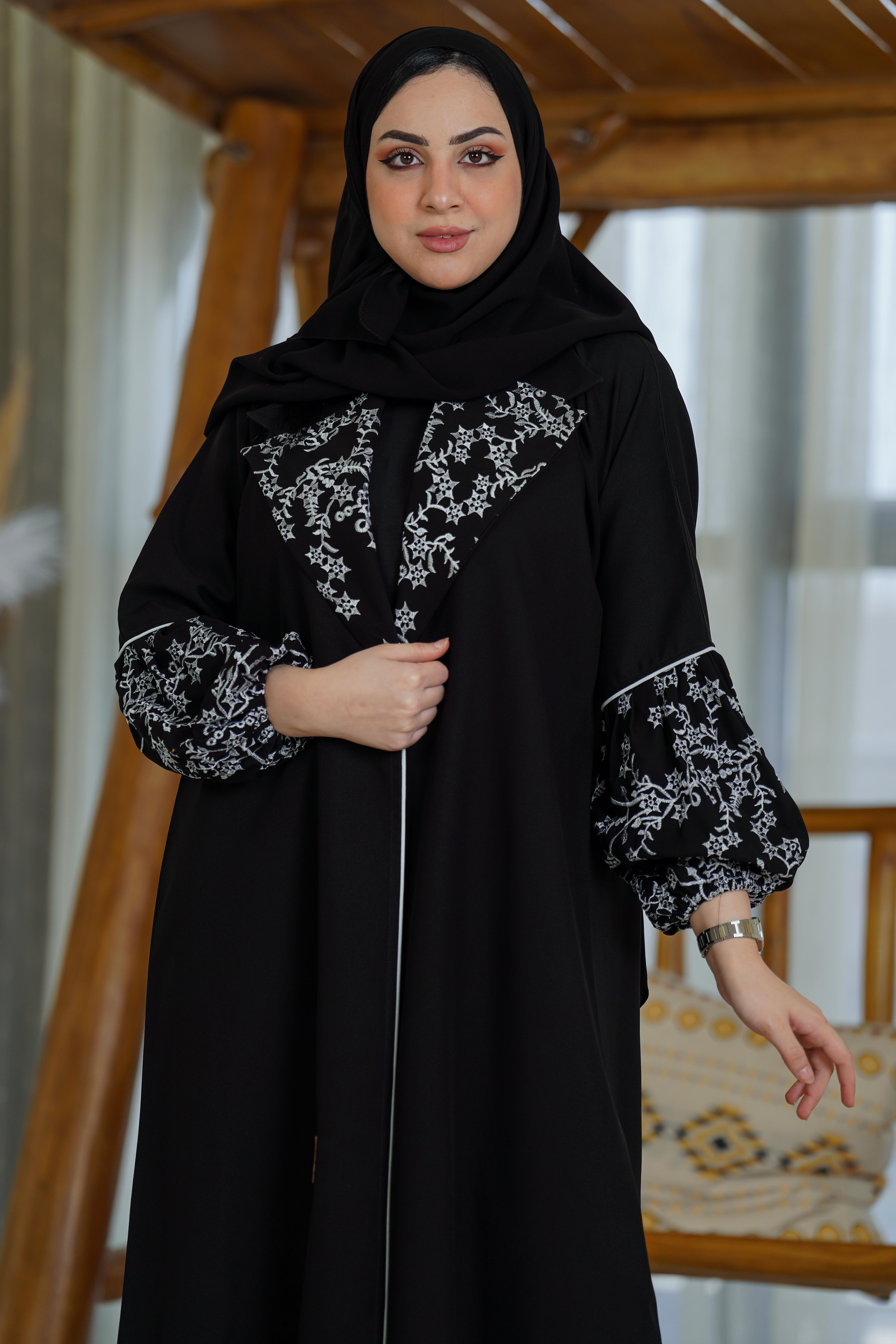 عباية بياقة انيقة وكم مزموم وتطريز ع الياقة والكم، مع تحديد قيطان، تتميز بقصتها الواسعة مع تدخيلات تطريز باللون الابيض على الكم والياقة، تزيد من ترتديها أنوثه وجمال، تأتي بأكمام مزمومة متعددة الاستخدامات يمكن لبسها كـ عباية تخرج أو للمناسبات والدوامات