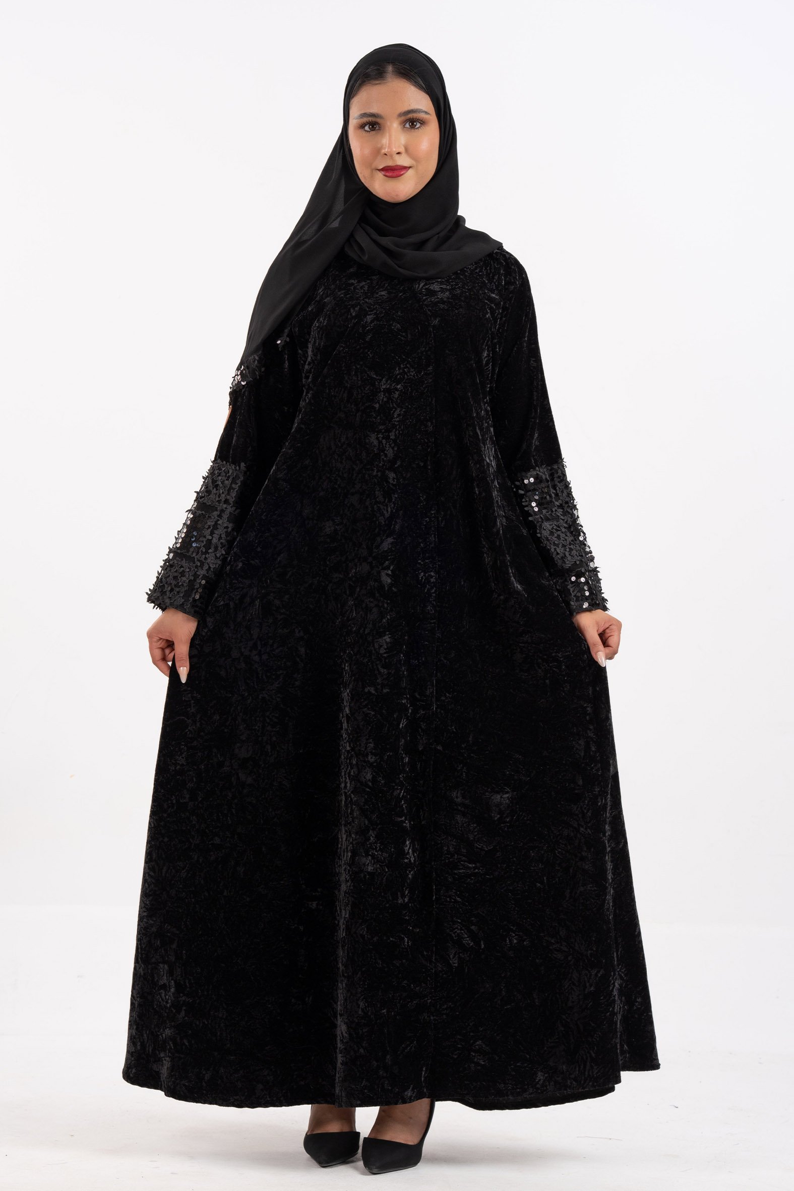 عباية أفنان شتوية منسوجة من قماش المخمل الأسود مع تدخيلات قماش مطرز بورود ناعمة ومرصعة بشك كريستال فاخر على الأكمام صممت لتناسب الاستخدام اليومي والطلعات تصميمها الناعم يضفي لمسة من الجاذبية والرقي مما يجعلها مثالية للإطلالات المميزة صممت بقصه انسيابية العباية ناعمة بالحركة لتلائم كل مناسباتك الشتوية. مع طرحة مجانية وجربي تنسيقها مع فستان عباية