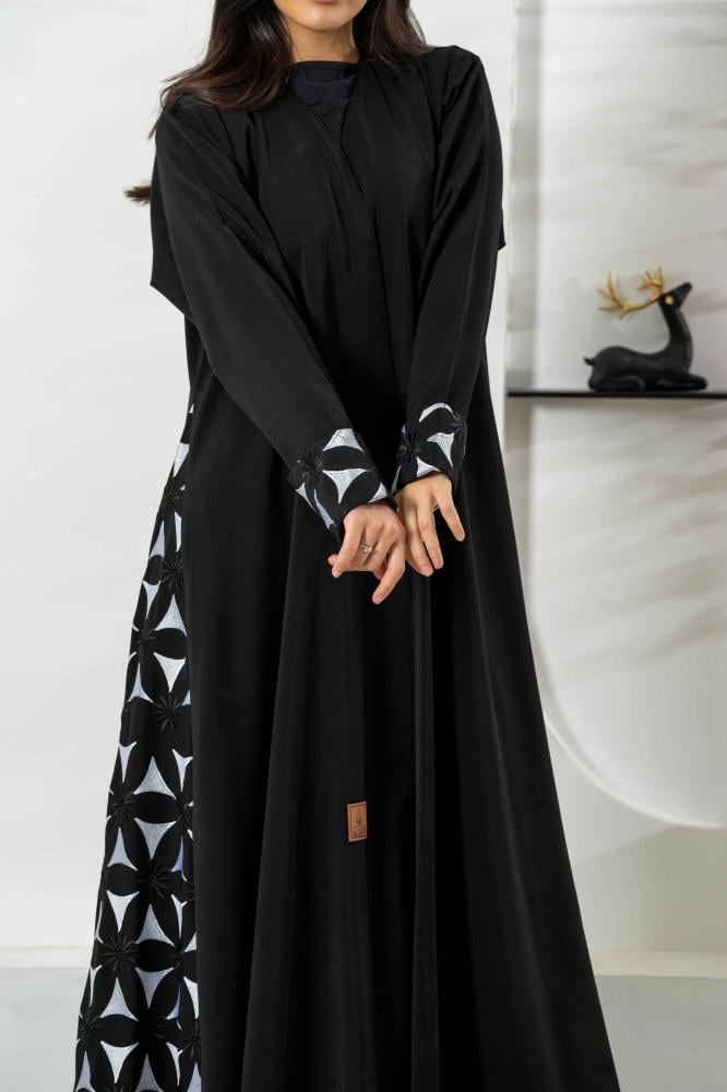 عباية كلوش نسائية أنيقة مزينة بتدخيلات تطريز أبيض ناعم على الجوانب والأكمام تصميمها الرقيق يضفي لمسة من الرقي والبساطة مما يجعلها مثالية للمناسبات الخاصة والإطلالات اليومية صممت بقصه انسيابية العباية ناعمة بالحركة لتلائم كل مناسباتك. مع طرحة مجانية وجربي تنسيقها مع فستان عباية