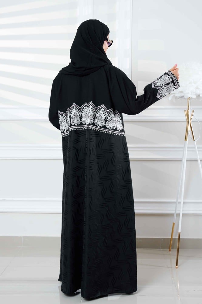 Cعباية برنسييسة اسود بتدخيلات تطريز عالكم والخلف وتتميز بتدخيلة قماش الجاكار من الخلف العباية بطابع عصري اناقتها تأخذك لوجهة غير مسبوقة صممت لتلائم كل مناسباتك وطلعاتك العباية مع طرحة مجانية وجربي تنسيقها مع فستان عباية
