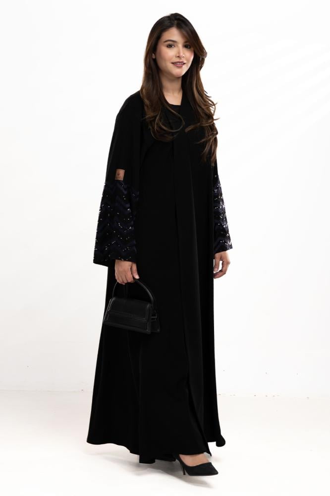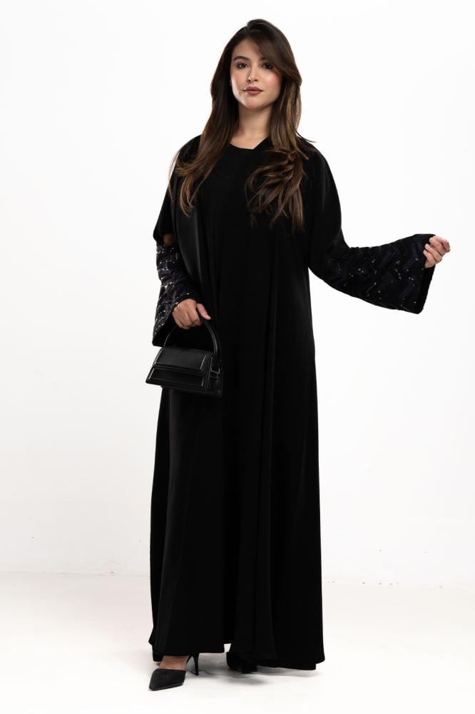 لمسة فخامة باللون الأسود الكلاسيكي، تزيّنها تطريزات رقيقة مع ترتر رمادي غامق على الأكمام تمنحك بريقاً ناعماً وأناقة لا تُقاوم. صممت بقصه انسيابية ا لتلائم كل مناسباتك. مع طرحة مجانية مطرزة من نفس العباية وجربي تنسيقها مع فستان عباية