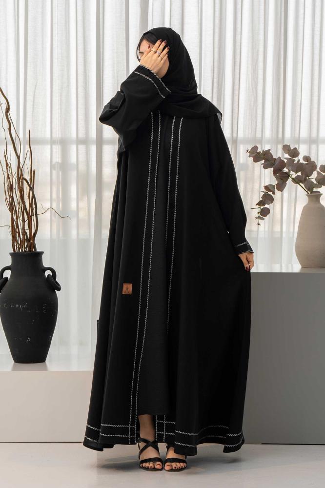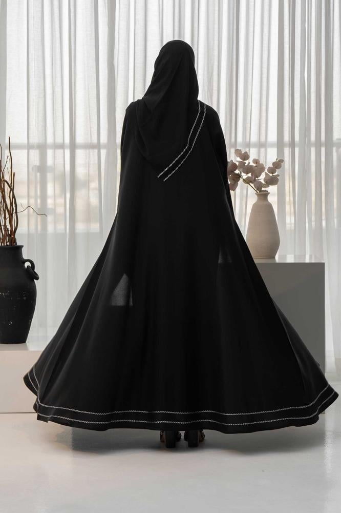 عباية سوداء كلوش بتصميم ناعم وأنيق مزينة بلمسات من القيطان الفضي لإطلالة لامثيل لها مثالية لكل المناسبات.