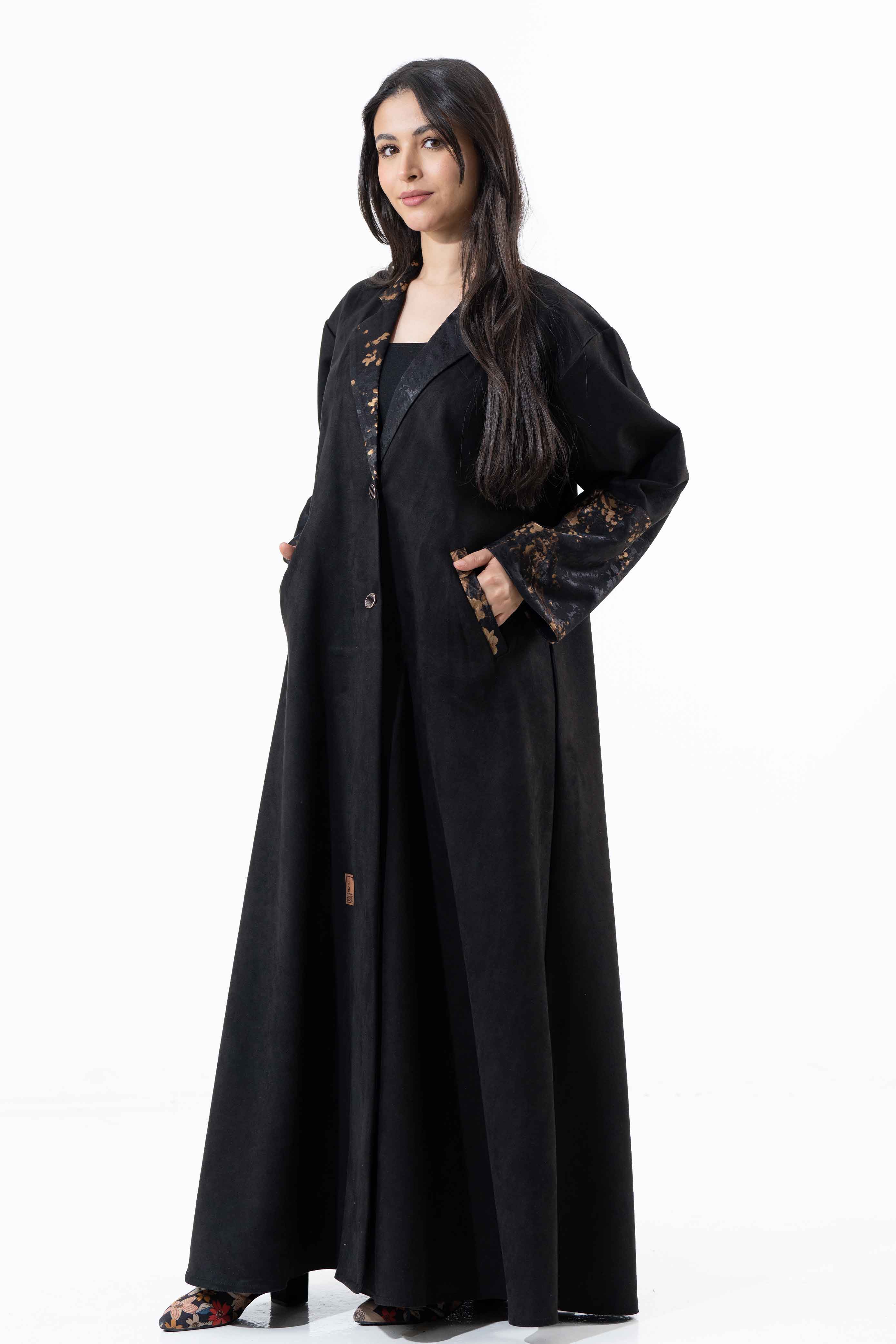 عباية كلوش شتوية منسوجة من قماش الشامواة الأسود مع تدخيلات قماش الكشميري على الياقة واليدين والجيوب صممت لتناسب الاستحدام اليومي والطلعات تصميمها الأنيق يضفي لمسة من الجاذبية والرقي مما يجعلها مثالية للإطلالات المميزة صممت بقصه انسيابية العباية ناعمة بالحركة لتلائم كل مناسباتك الشتوية. مع طرحة مجانية وجربي تنسيقها مع فستان عباية