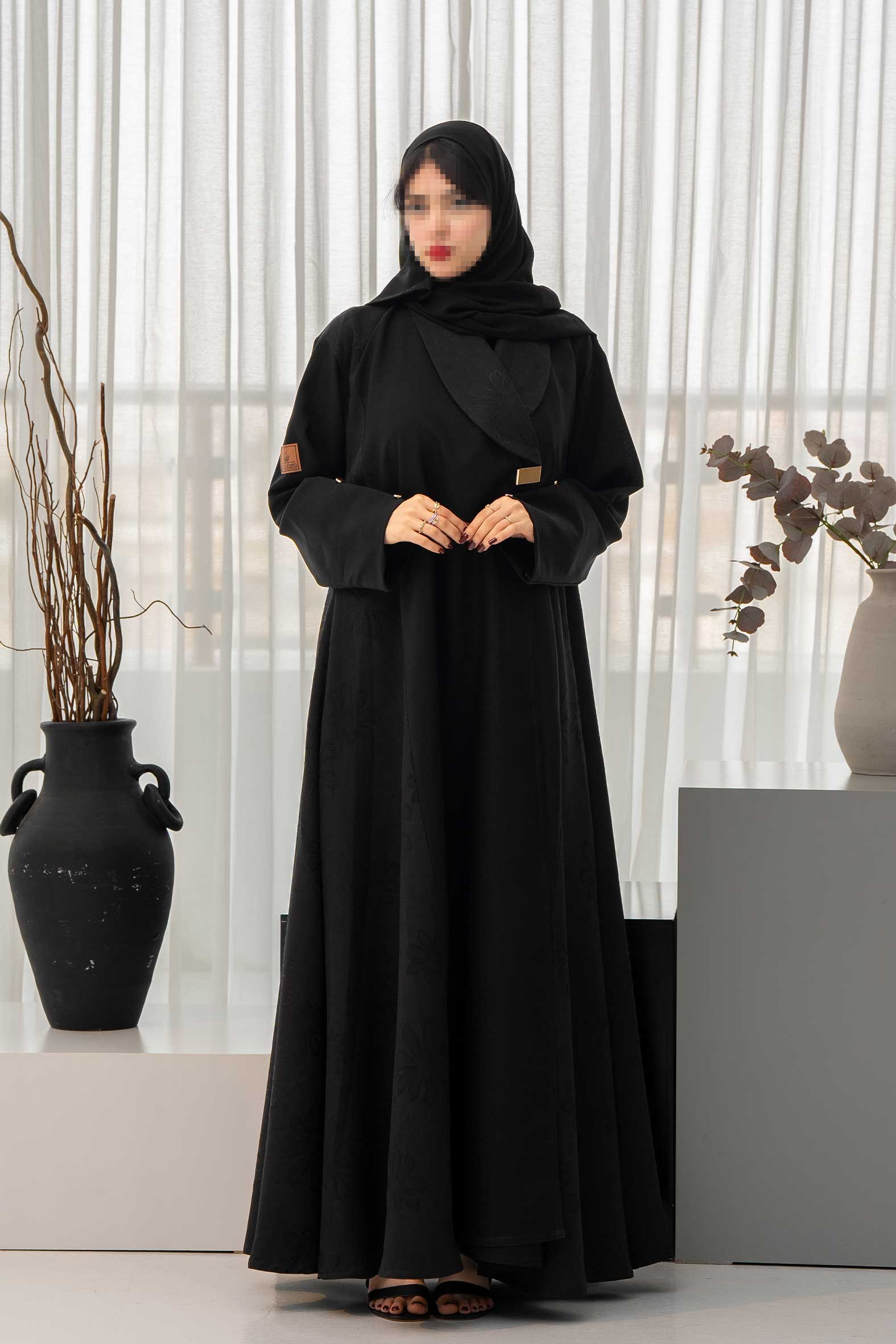 عباية رسمية أنيقة بقصة مموجة تضيف لمسة راقية ومريحة مزينة بتدخيلات شك فاخرة وتطريز ورد من الجنب الأيمن تجعل إطلالتك فريدة ومميزة. صممت بقصه انسيابية ا لتلائم كل مناسباتك. مع طرحة مجانية مطرزة من نفس العباية وجربي تنسيقها مع فستان عباية