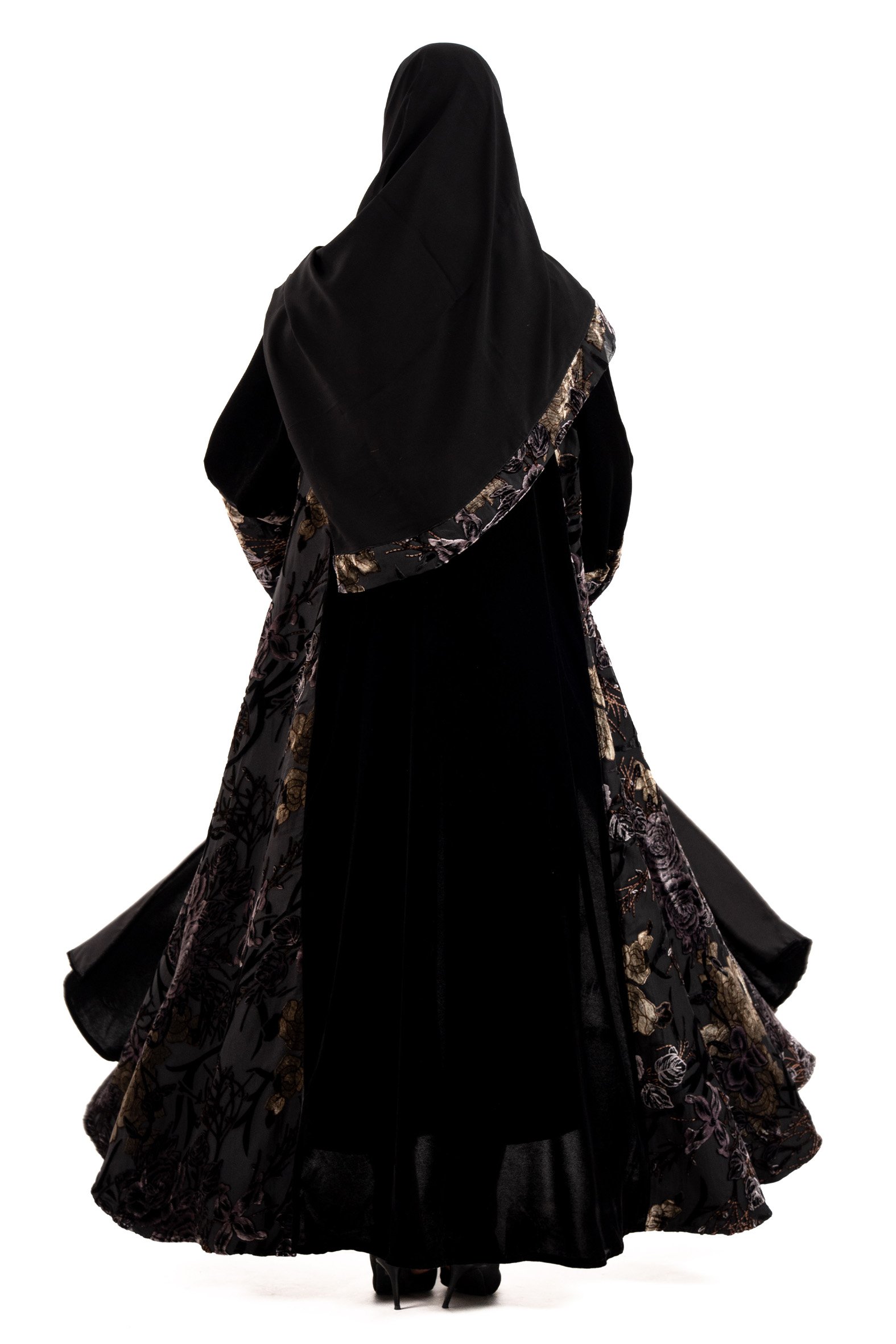 عباية نص كلوش شتوية منسوجة من قماش المخمل الأسود مع تدخيلات قماش المخمل المشخر على الأكمام والجوانب صممت لتناسب الاستحدام اليومي والطلعات تصميمها الناعم يضفي لمسة من الجاذبية والرقي مما يجعلها مثالية للإطلالات المميزة صممت بقصه انسيابية العباية ناعمة بالحركة لتلائم كل مناسباتك الشتوية. مع طرحة مجانية وجربي تنسيقها مع فستان عباية