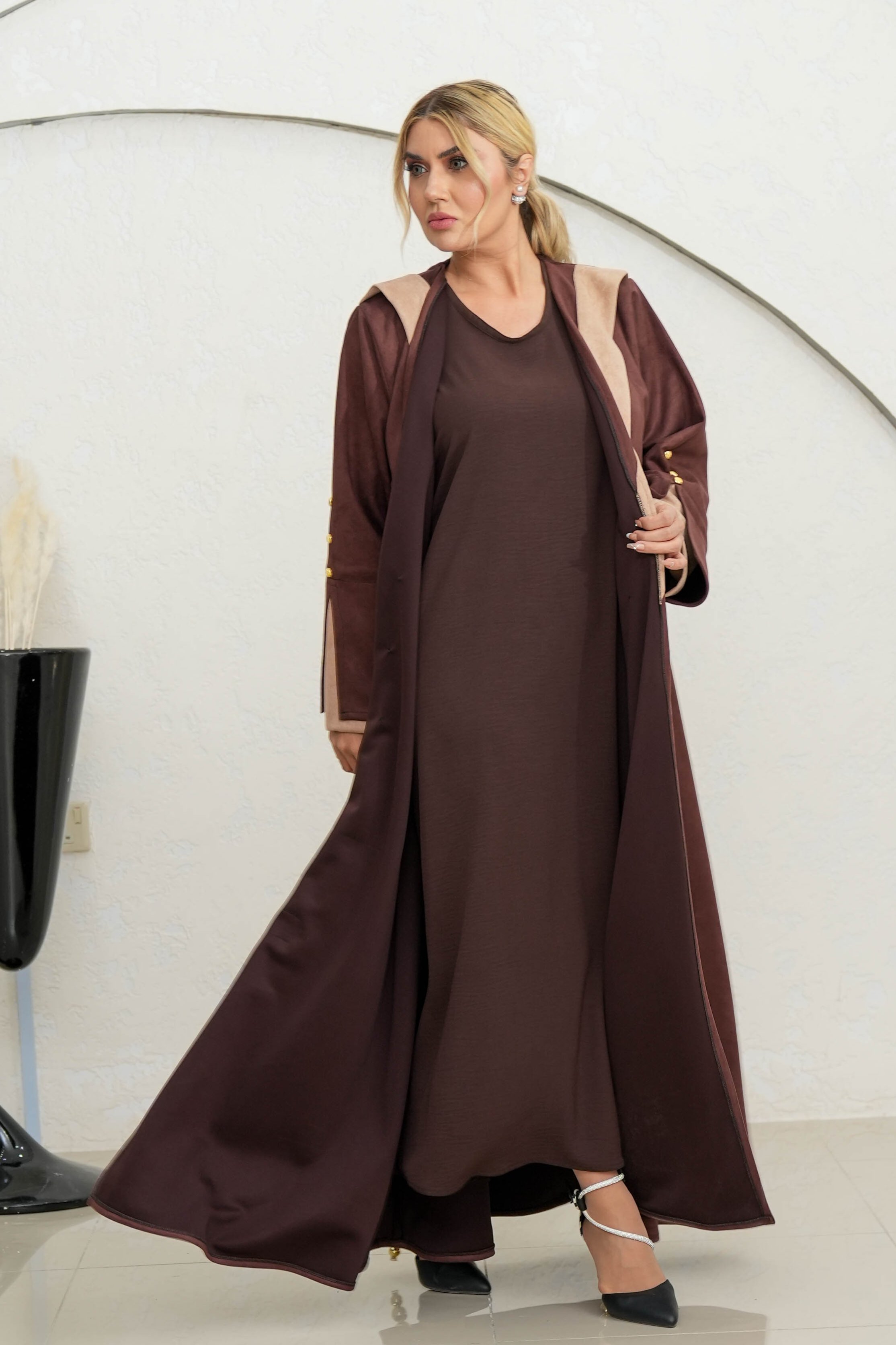 عباية شتوية شاموه بني مع تدخيلات قماش بيج وأزارير ذهبي