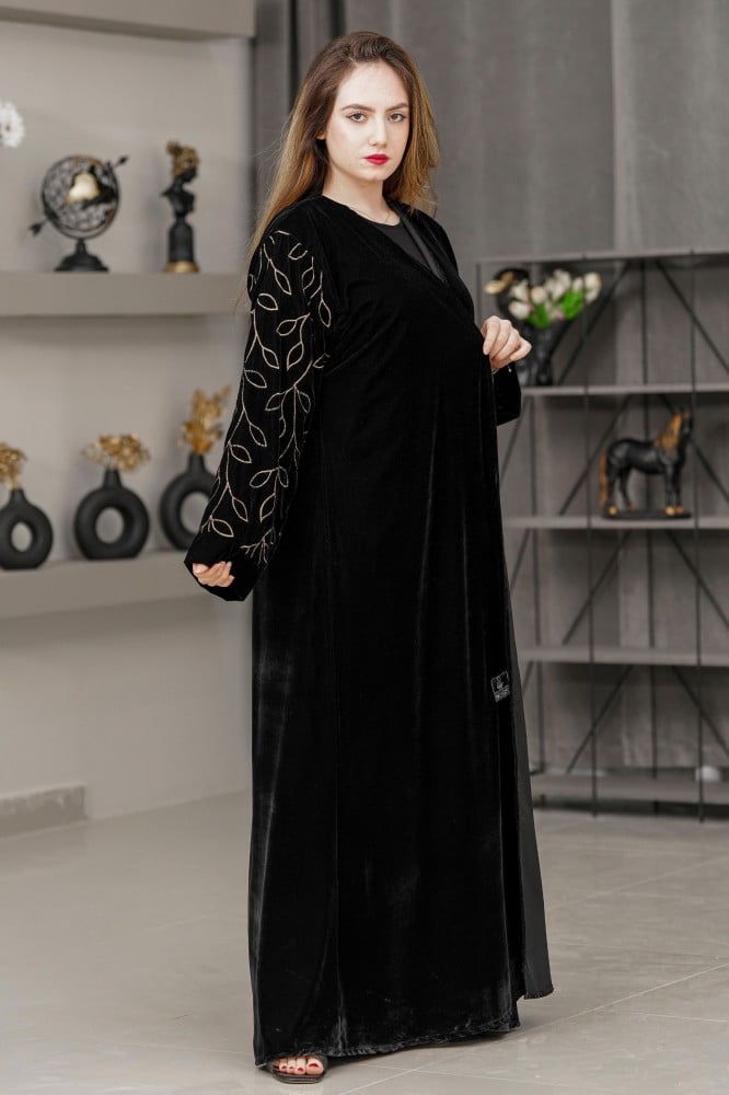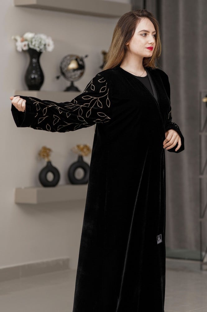 عباية مخمل أسود مع تطريز ذهبي على الأكمام