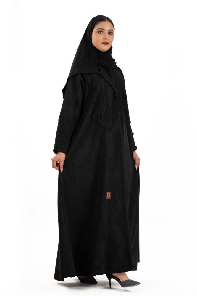 مزيج فاخر من الشمواه الناعم وتفاصيل الجاكار على الصدر يمنح العباية حضورًا آسرًا وأناقة لا تُضاهى.