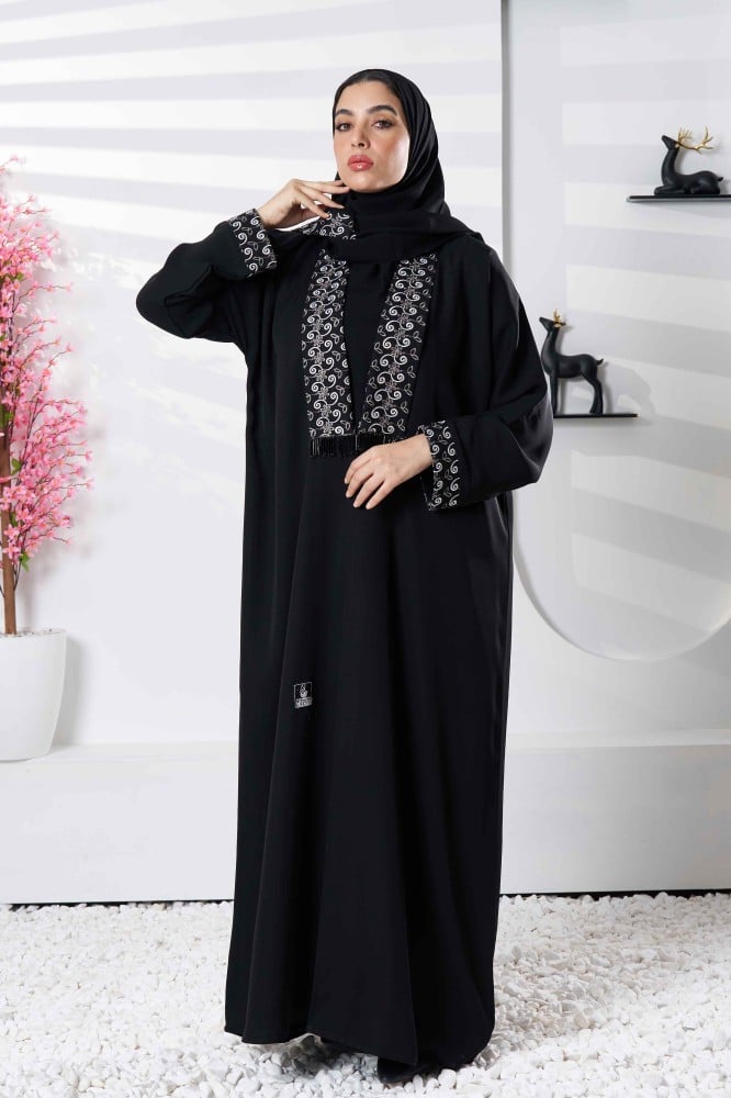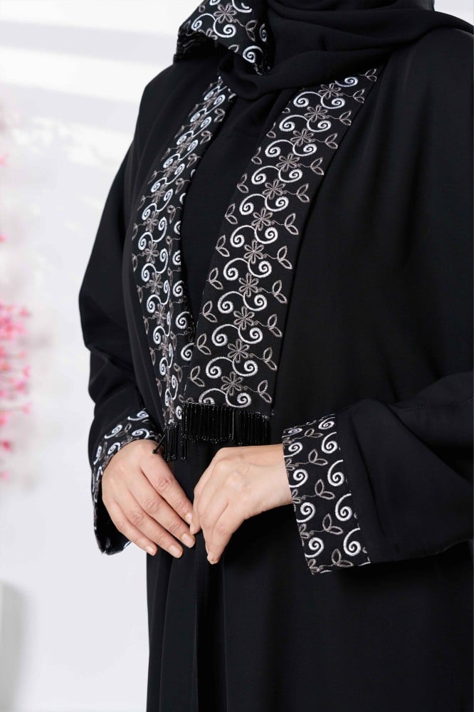 عباية سوداء عصرية بطابع رسمي وأنيق ذات قصة كلاسيكية مع تدخيلات تطريز ع الياقة وهدب كرستال مع طرحة مجانية وجربي تنسيقها مع فستان عباية