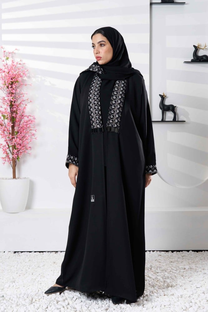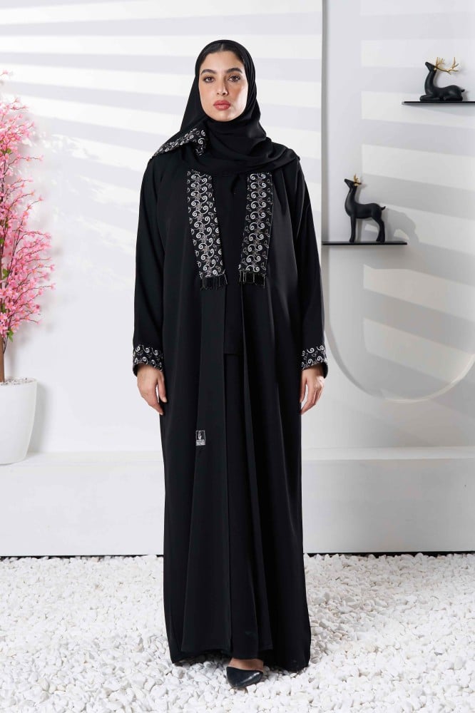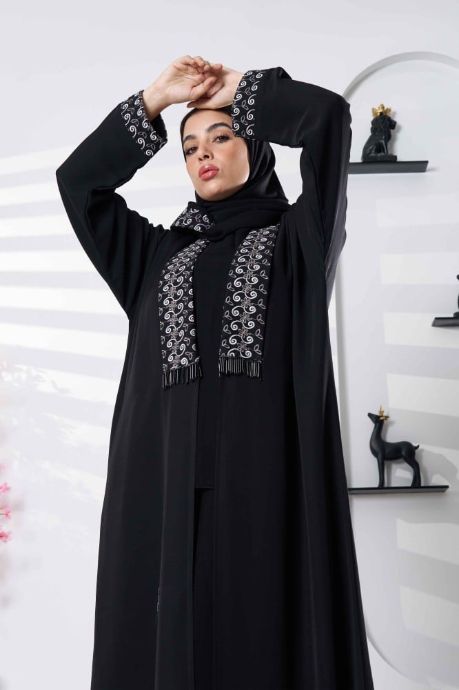 عباية سوداء فاخرة بتدخيلات تطريز وهدب كرستال