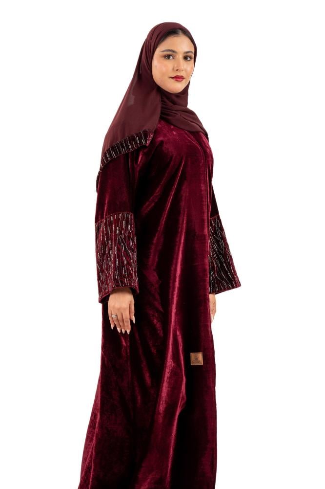 عباية أفنان شتوية منسوجة من قماش المخمل العنابي مع تدخيلات قماش مخمل مطرز بكرستال على الأكمام صممت لتناسب الاستخدام اليومي والطلعات تصميمها الناعم يضفي لمسة من الجاذبية والرقي مما يجعلها مثالية للإطلالات المميزة صممت بقصه انسيابية العباية ناعمة بالحركة لتلائم كل مناسباتك الشتوية. مع طرحة مجانية وجربي تنسيقها مع فستان عباية