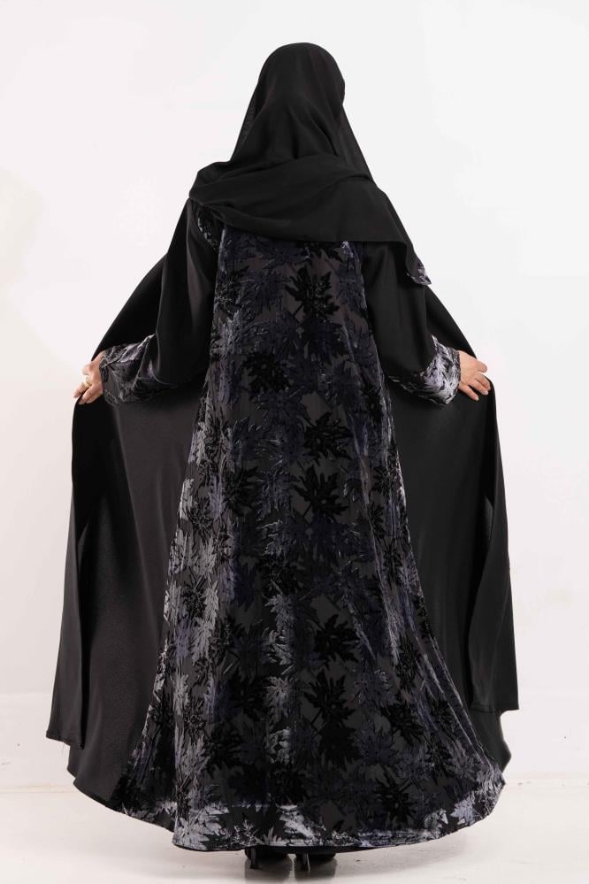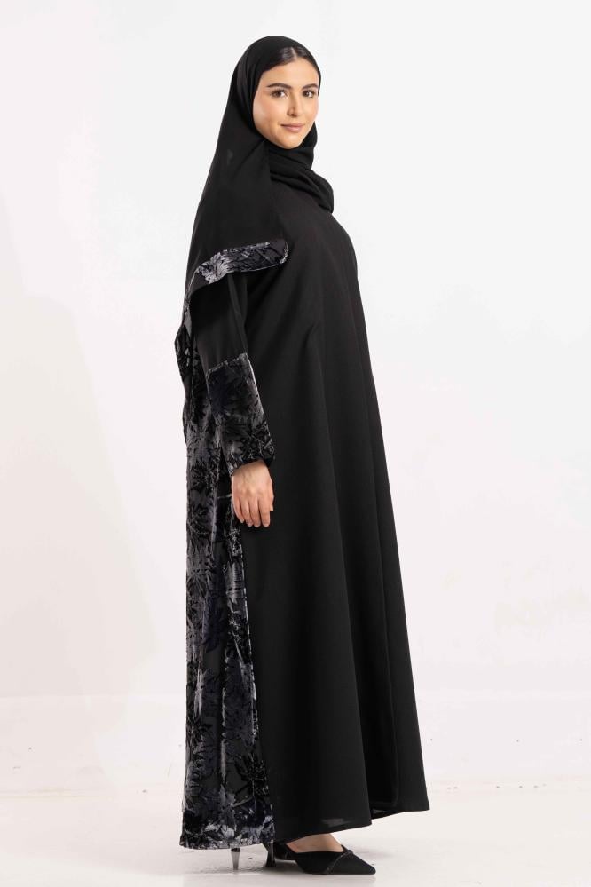 عباية سوداء أنيقة بتصميم فريد يجمع بين الرقي والفخامة تتميز العباية بتدخيلة من قماش الجاكار الفاخر في الخلف مزينة بتطريز راقٍ من الورود المخملية التي تضيف لمسة أنثوية ساحرة التصميم الانسيابي للعباية يمنحك إطلالة راقية مع تفاصيل دقيقة تعكس الأناقة العصرية مثالية للمناسبات الخاصة والإطلالات الفاخرة حيث تجمع بين الفخامة والراحة بكل أناقة