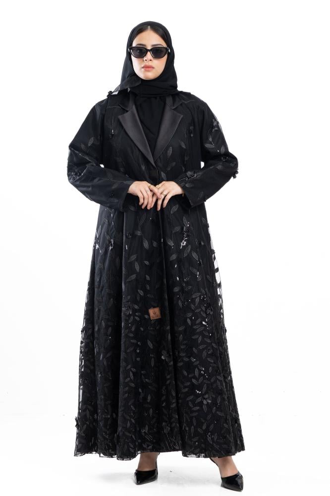 طيف عباية لا تمر بل تترك أثراً.منسوجة من الكتان الكوري الفاخر تعانقها طبقة شفّافة من التل الأسود المطرز مرصعة بخرز أسود براق يلمع كالنجوم في سماء حالكة. تصميم يجمع بين الهيبة والأنوثة يهمس بالفخامة ويصرخ بالرقي“طيف” ليست مجرد عباية إنها حضور يُرى حتى في الغياب صممت بقصه انسيابية العباية ناعمة بالحركة لتلائم كل مناسباتك. مع طرحة مجانية وجربي تنسيقها مع فستان عباية