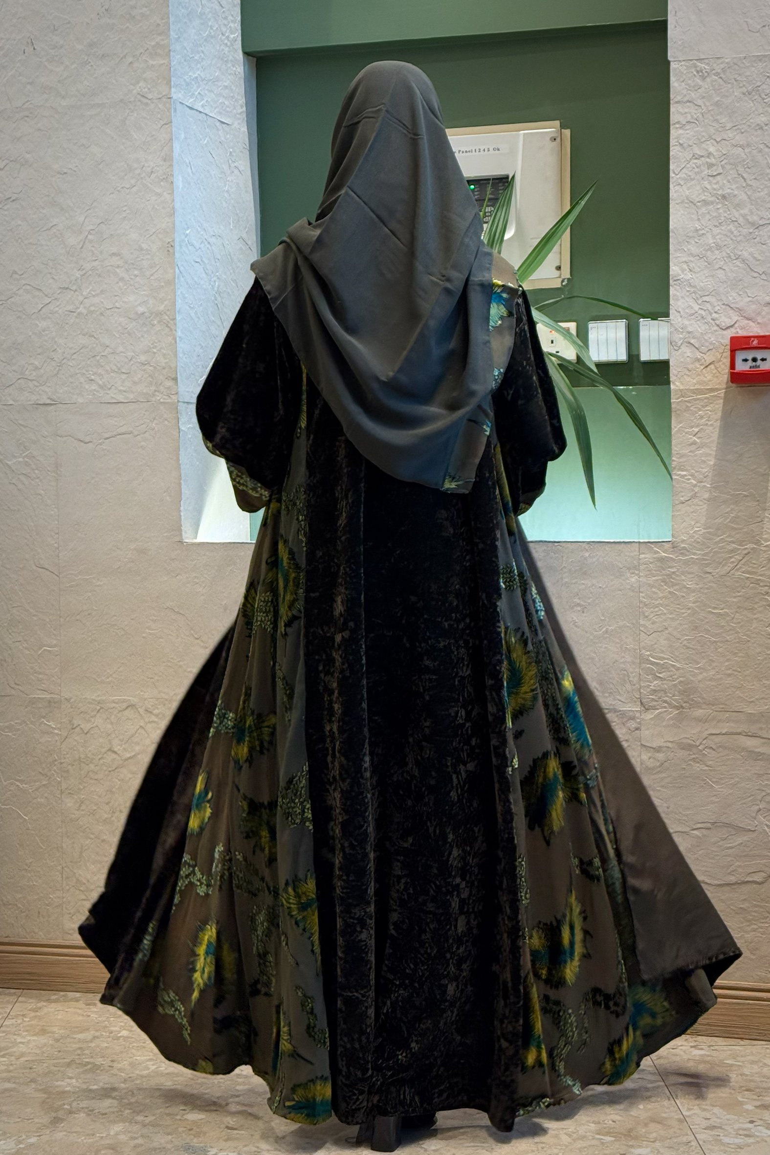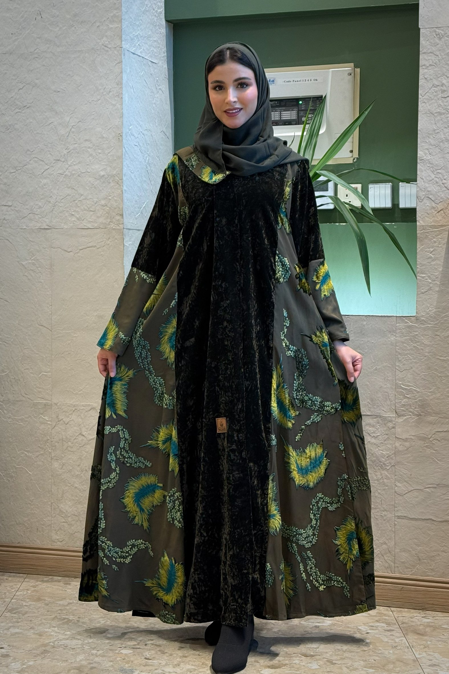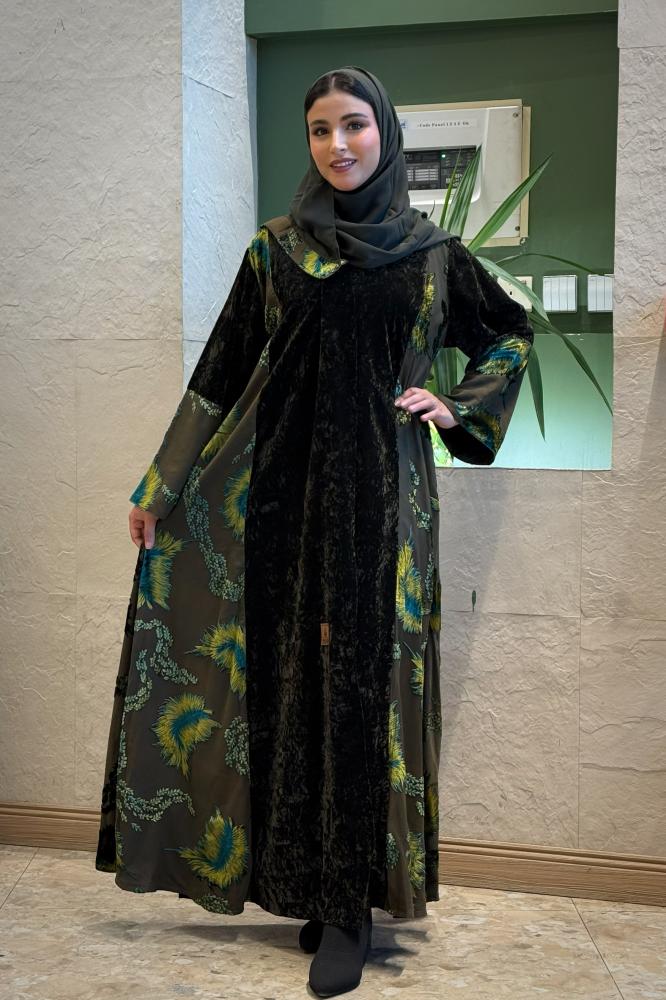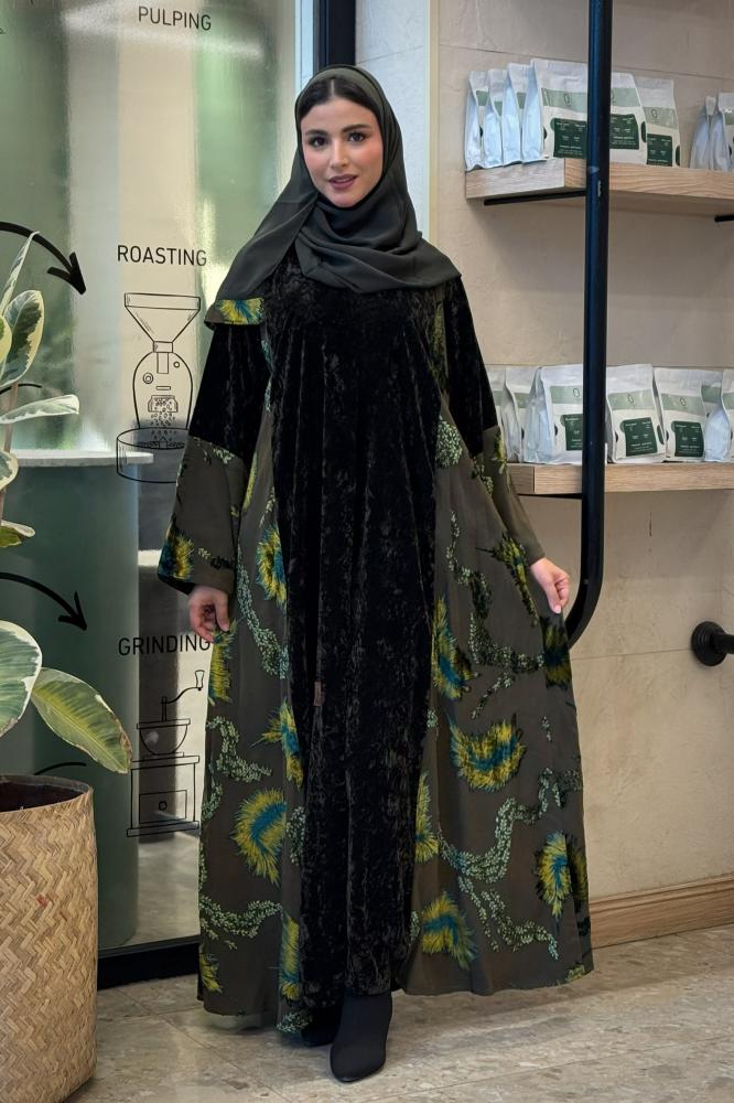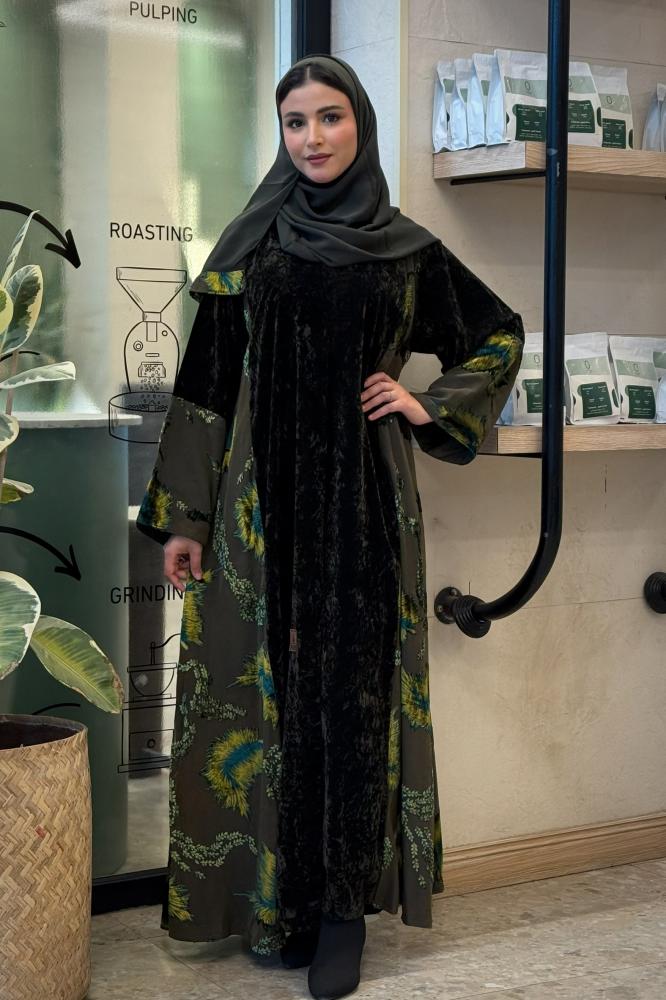 عباية شتوية منسوجة من قماش الشامواه الاسود مع تدخيلات قماش مطرز بورود ناعمة ومرصعة بشك كريستال فاخر على الأكمام وامام العباية. صممت لتناسب الاستخدام اليومي والطلعات تصميمها الناعم يضفي لمسة من الجاذبية والرقي مما يجعلها مثالية للإطلالات المميزة صممت بقصه انسيابية العباية ناعمة بالحركة لتلائم كل مناسباتك الشتوية. مع طرحة مجانية وجربي تنسيقها مع فستان عباية