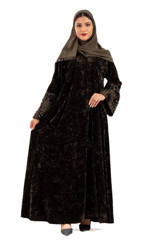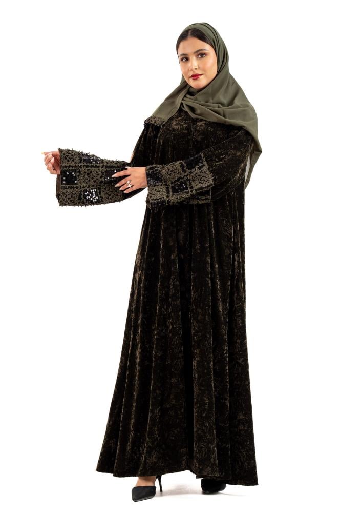 عباية أفنان شتوية منسوجة من قماش المخمل الزيتي مع تدخيلات قماش مطرز بورود ناعمة ومرصعة بشك كريستال فاخر على الأكمام صممت لتناسب الاستخدام اليومي والطلعات تصميمها الناعم يضفي لمسة من الجاذبية والرقي مما يجعلها مثالية للإطلالات المميزة صممت بقصه انسيابية العباية ناعمة بالحركة لتلائم كل مناسباتك الشتوية. مع طرحة مجانية وجربي تنسيقها مع فستان عباية
