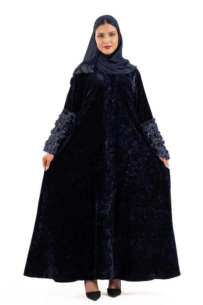 عباية أفنان شتوية منسوجة من قماش المخمل الكحلي مع تدخيلات قماش مطرز بورود ناعمة ومرصعة بشك كريستال فاخر على الاكمام صممت لتناسب الاستخدام اليومي والطلعات تصميمها الناعم يضفي لمسة من الجاذبية والرقي مما يجعلها مثالية للإطلالات المميزة صممت بقصه انسيابية العباية ناعمة بالحركة لتلائم كل مناسباتك الشتوية. مع طرحة مجانية وجربي تنسيقها مع فستان عباية