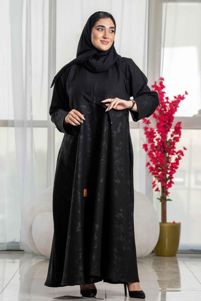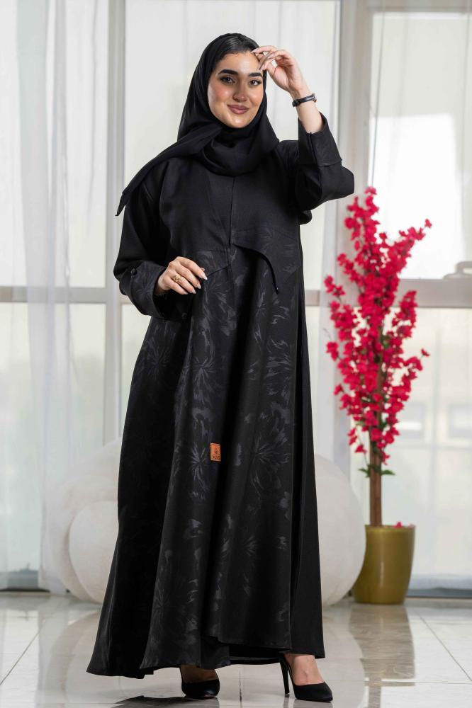 عباية كلوش أسود بتدخيلات رسمة ناعمة من الأمام