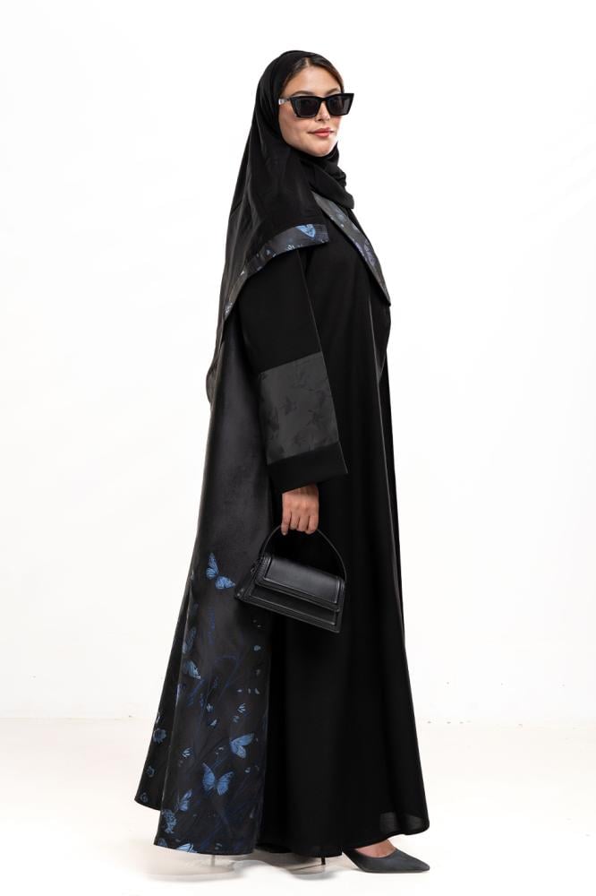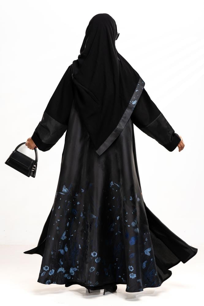 عباية فاخرة تنطق بالأناقة منسوجة من القماش الأسود الملكي تتخللها لمسات ساحرة من قماش مزخرف بنقش ورد ورسمة فراشة بالكحلي العميق في توليفة راقية تُجسد نعومة الأنثى وقوة حضورها بأسلوب فني لا يُنسى. صممت بقصه انسيابية لتلائم كل مناسباتك. مع طرحة مجانية مطرزة من نفس العباية وجربي تنسيقها مع فستان عباية