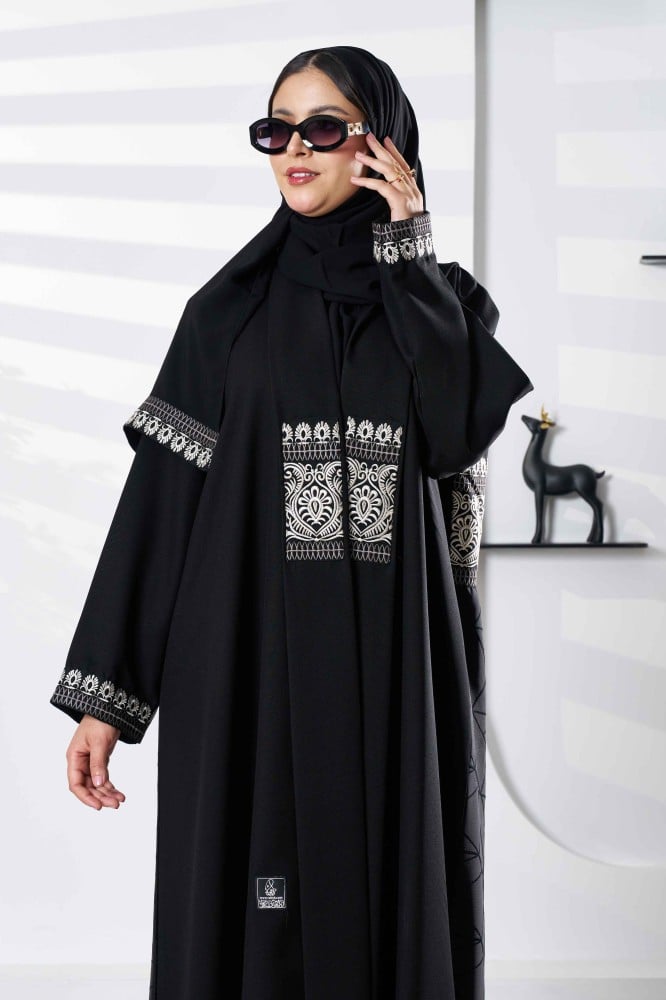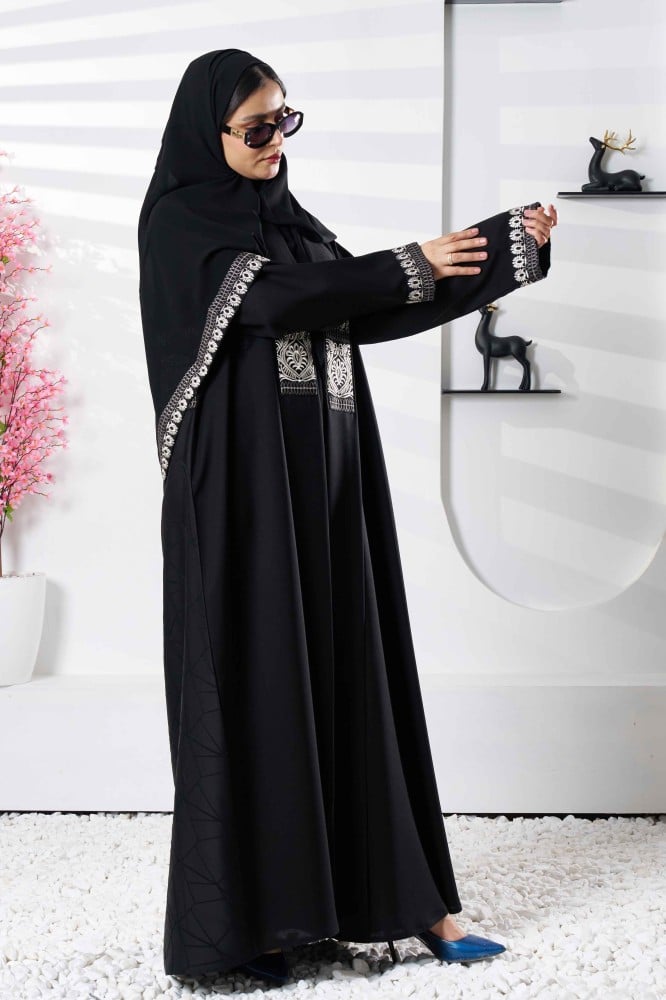 B عباية برنسييسة اسود بتدخيلات تطريز عالكم والخلف وتتميز بتدخيلة قماش الجاكار من الخلف العباية بطابع عصري اناقتها تأخذك لوجهة غير مسبوقة صممت لتلائم كل مناسباتك وطلعاتك العباية مع طرحة مجانية وجربي تنسيقها مع فستان عباية