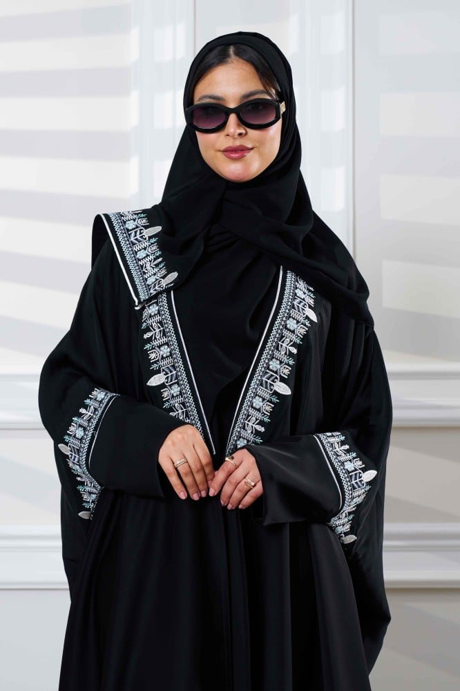 عباية بشت اسود بتدخيلات تطريز من الامام والكم