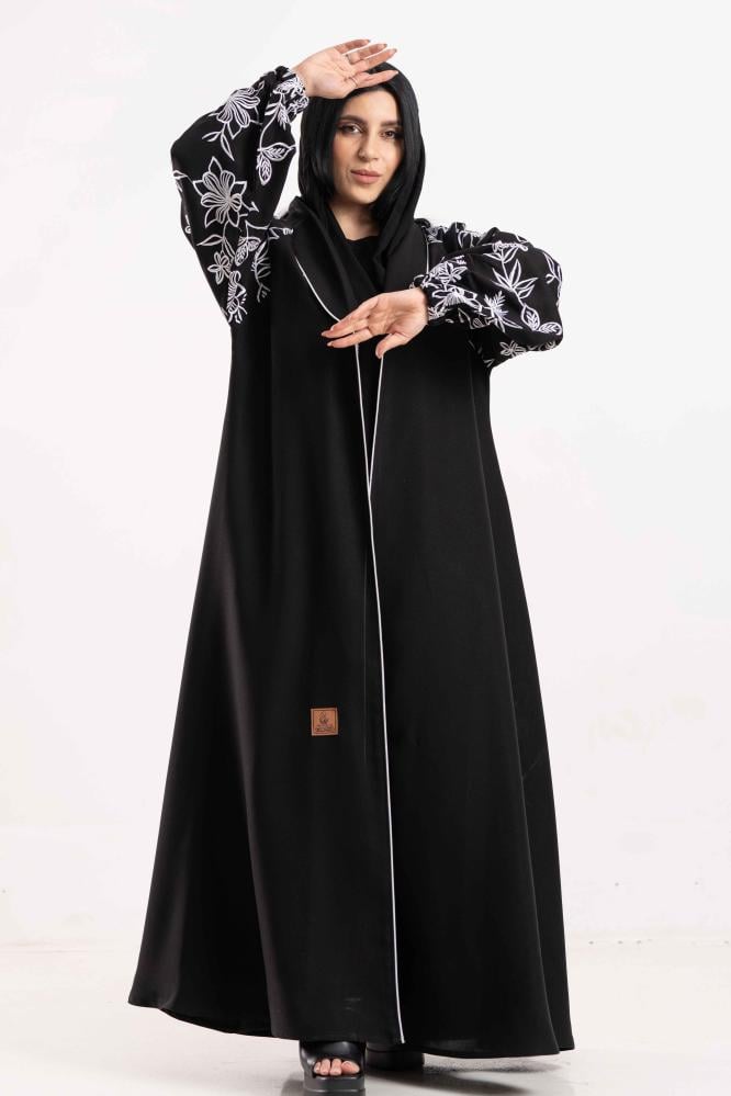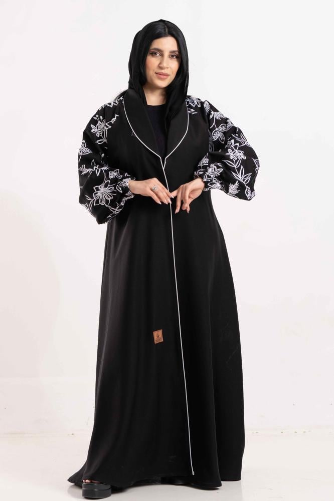 عباية بياقة واسعة مع تطريز ورد ابيض ع الكم