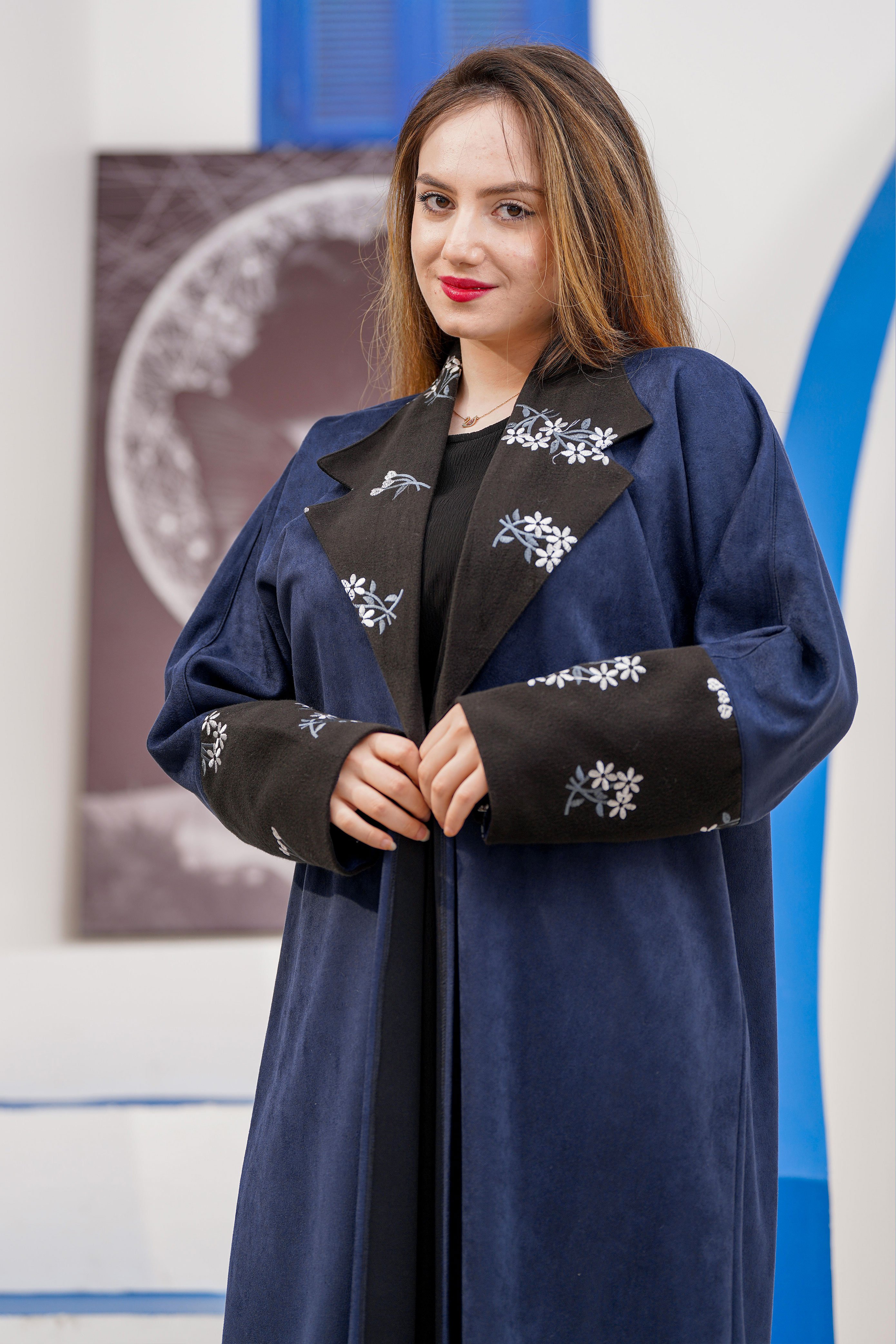 A winter navy blue suede abaya with a hood and fur inserts