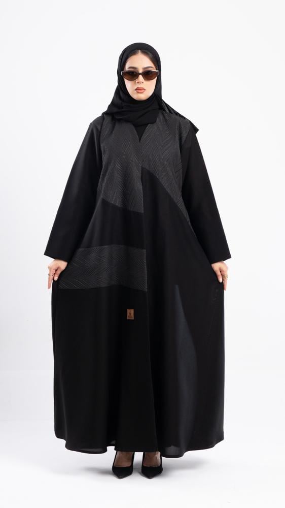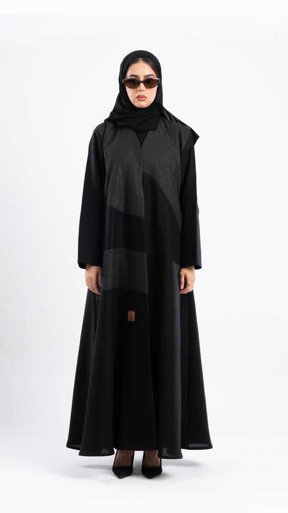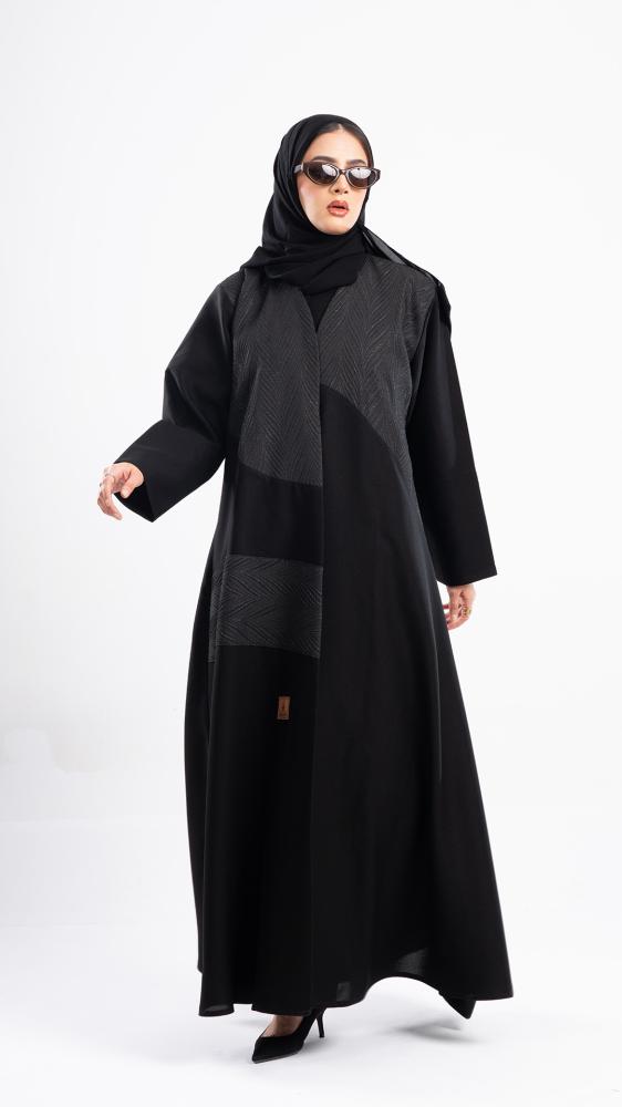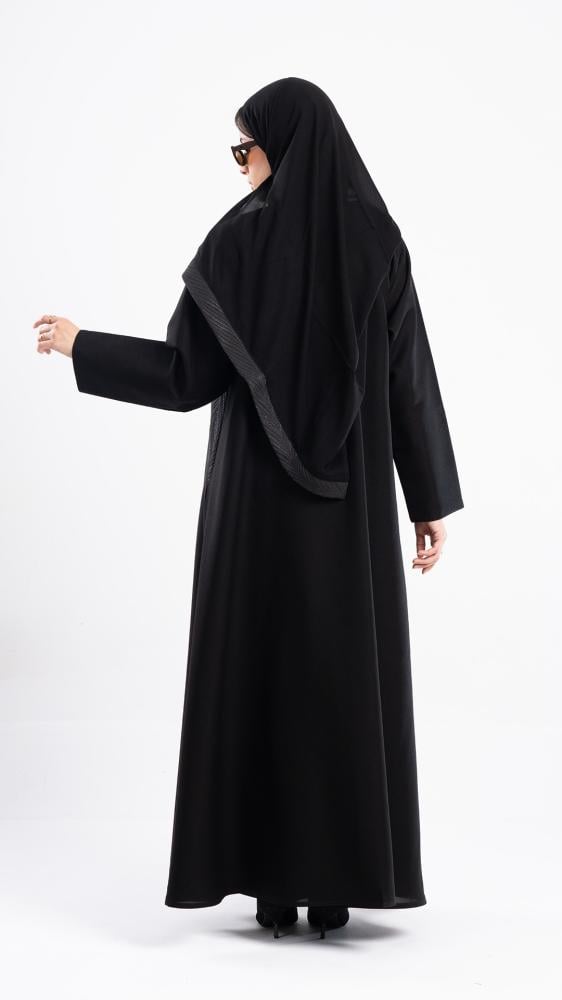 A luxurious black abaya with balanced striped embroidery on both chests and a delicate touch on the center left side. The exquisite design combines sophistication and simplicity, creating a luxurious and elegant look in every detail.
