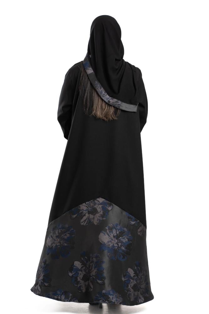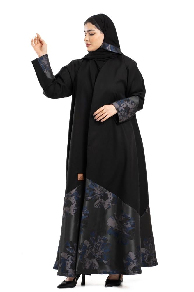The Hams Abaya exudes softness and uniqueness. A wavy design on the front and back with elegant fluidity, interspersed with a touch of luxurious navy blue jacquard fabric, in an elegant balance between calm and luxury . Designed with a flowing cut to suit all your occasions . With a free embroidered veil from the same abaya, try coordinating it with Abaya dress