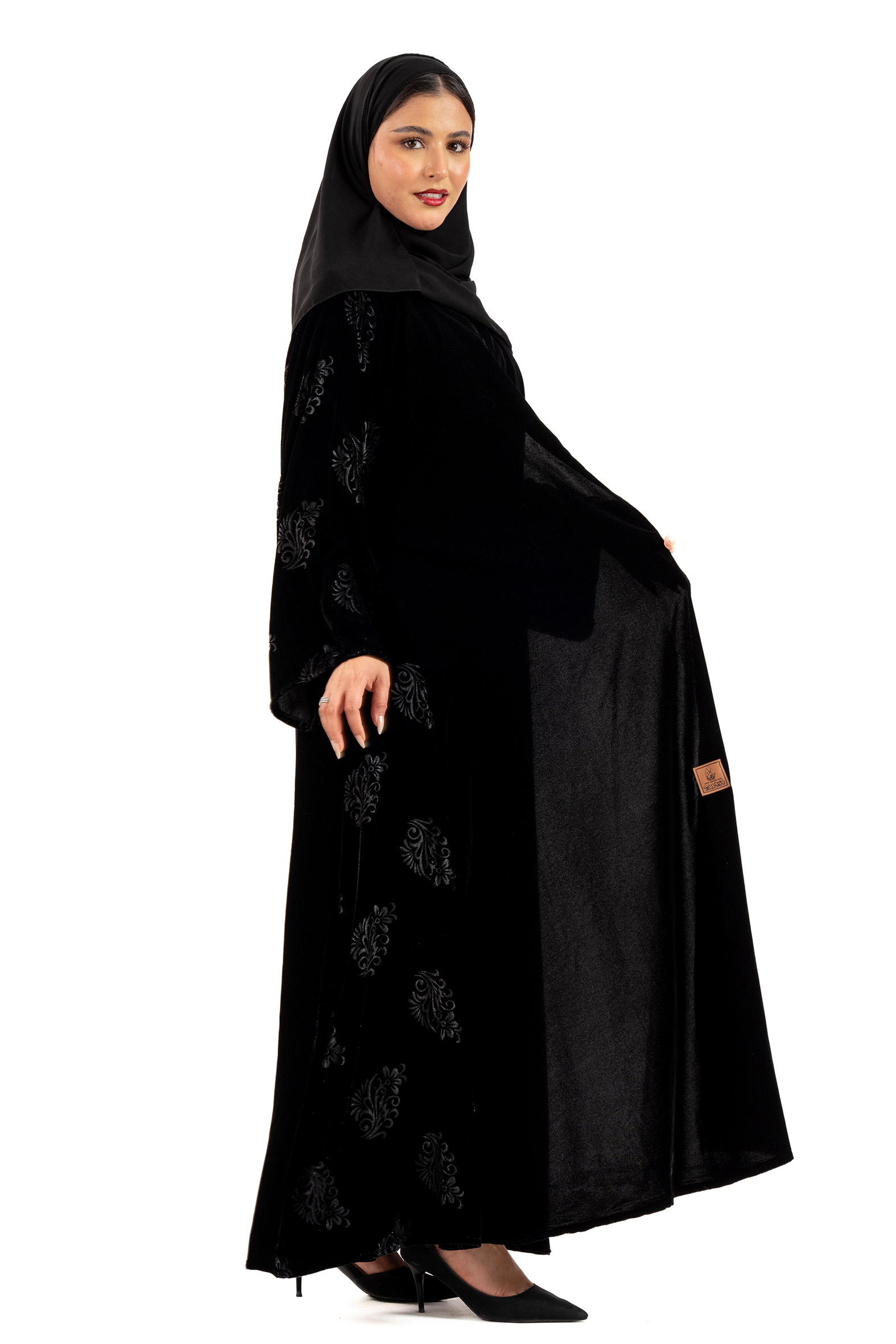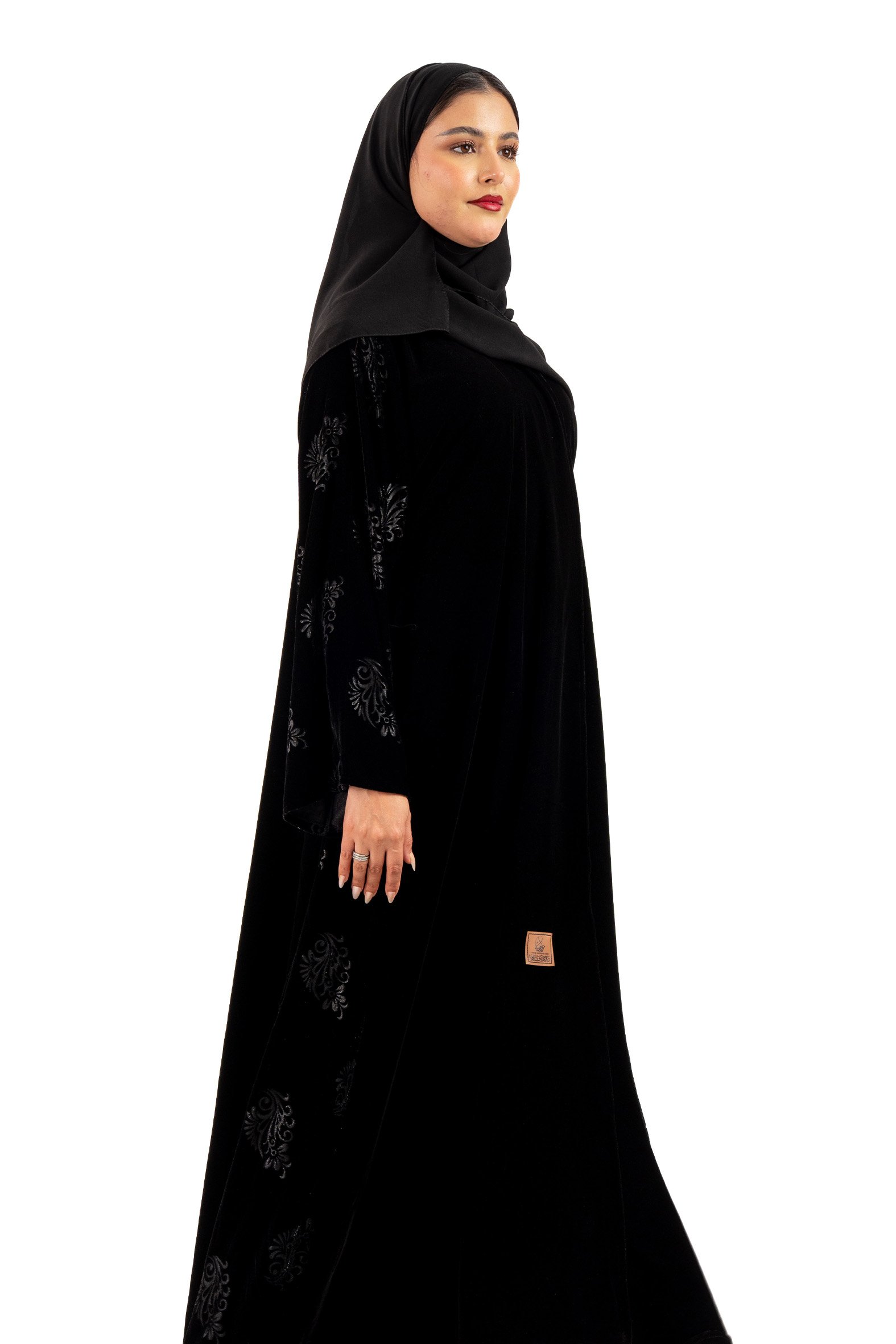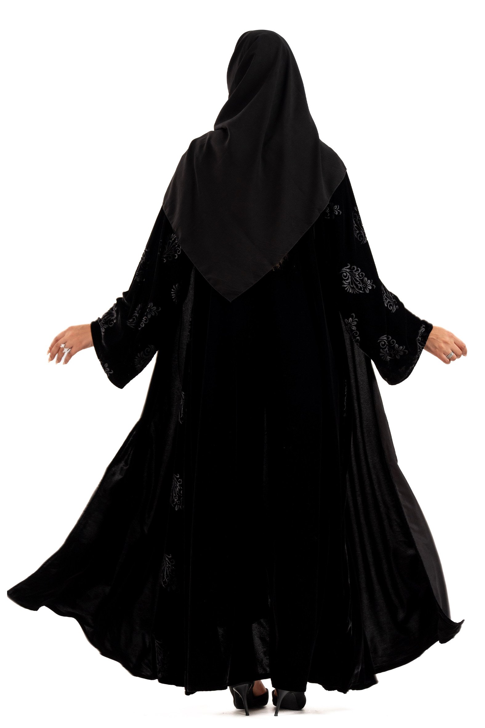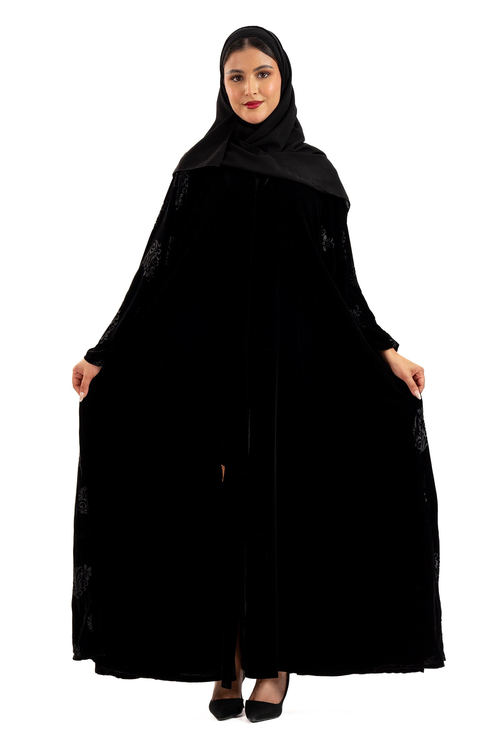 Bissan winter abaya woven from black velvet fabric with black velvet fabric inserts embroidered on the sleeves and sides. Designed to suit daily use and outings. Its soft design adds a touch of charm and elegance, making it ideal for distinctive looks. Designed with a flowing cut, the abaya is soft to move to suit all your occasions. Winter . With a free veil, try coordinating it with Abaya dress