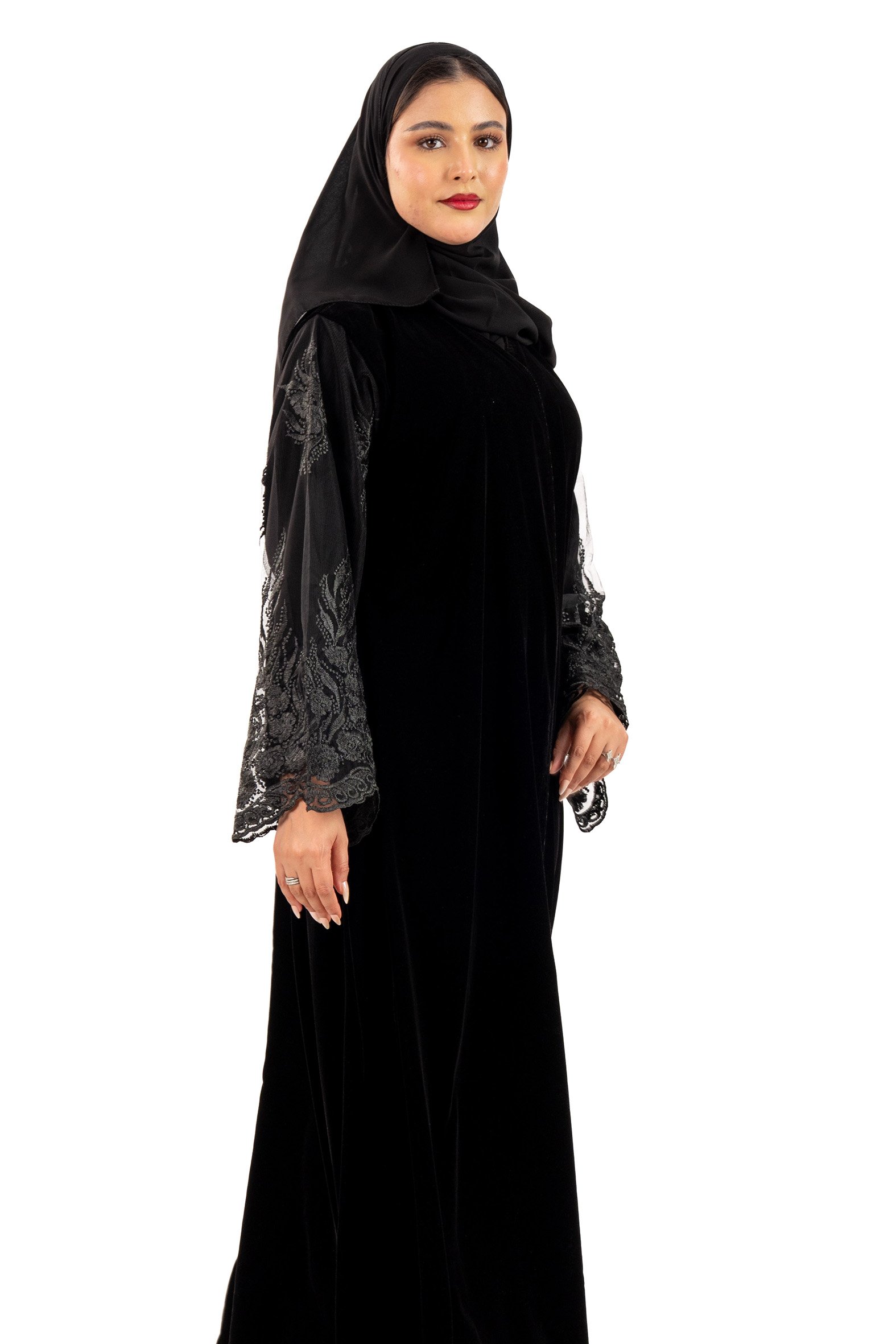 Lareen winter abaya woven from black velvet fabric with black lace fabric inserts on the sleeves. Designed for everyday use and outings. Its soft design adds a touch of charm and elegance, making it ideal for distinctive looks. Designed with a flowing cut, the abaya is soft to move to suit all your occasions. Winter . With a free veil, try coordinating it with Abaya dress
