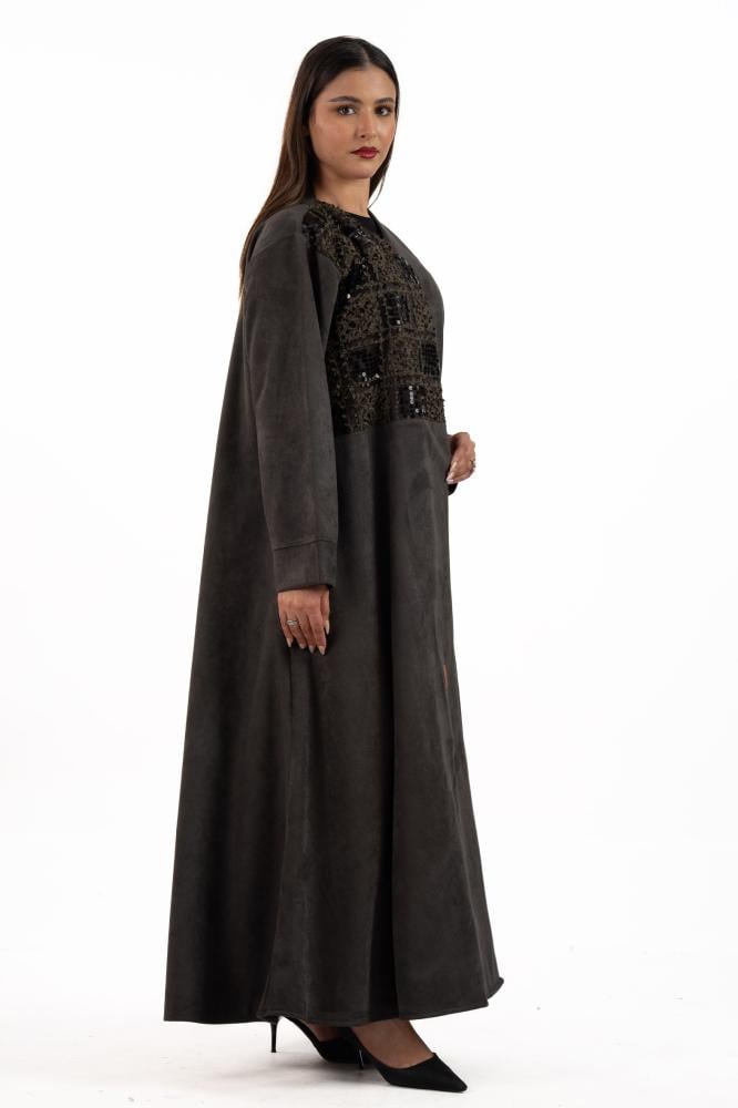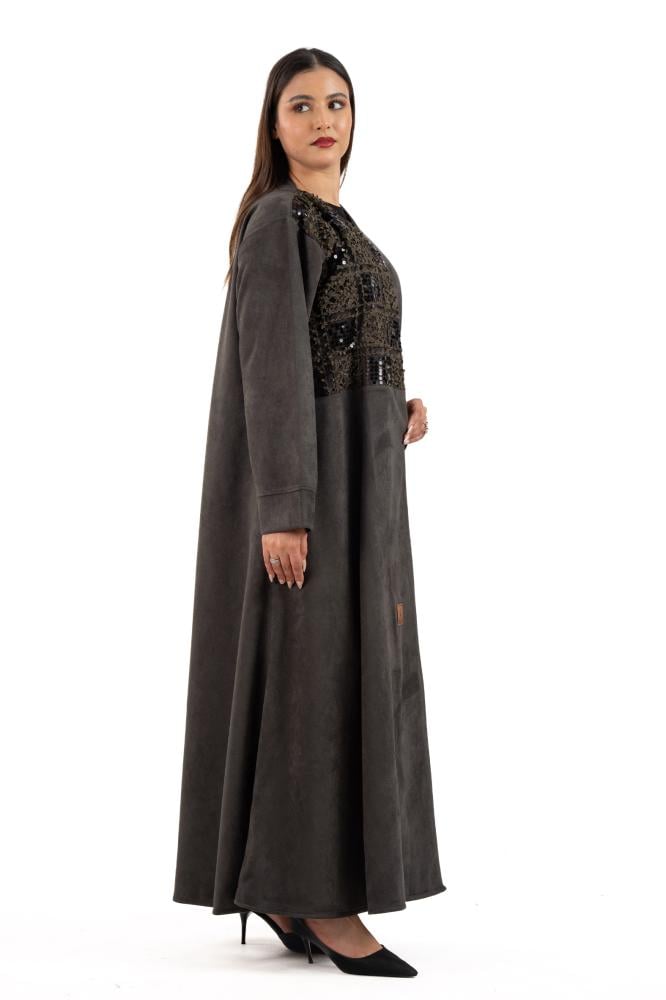 Abeer winter abaya woven from dark olive suede fabric with delicate floral embroidered fabric inserts and studded with luxurious crystal embroidery on the sleeves and front of the abaya. Designed for everyday use and outings, its soft design adds a touch of charm and elegance, making it ideal for distinctive looks. Designed with a flowing cut, the abaya is soft and smooth to move, making it suitable for all your occasions. Winter . With a free veil, try coordinating it with Abaya dress
